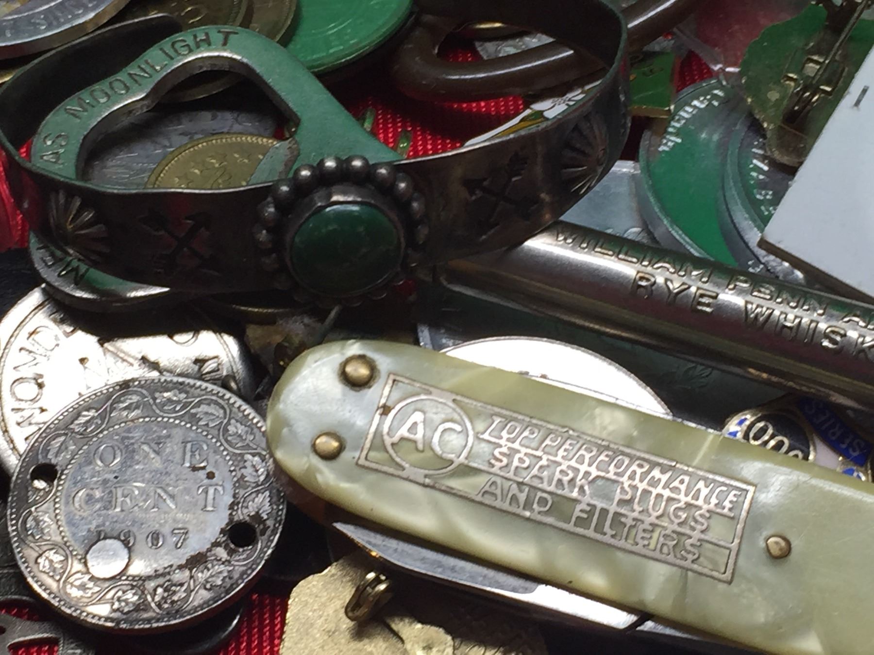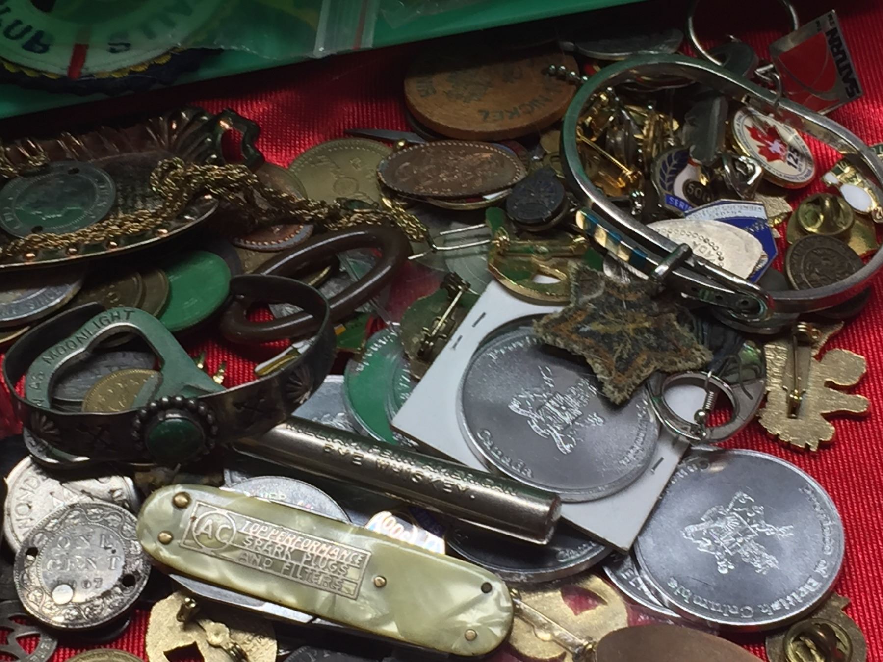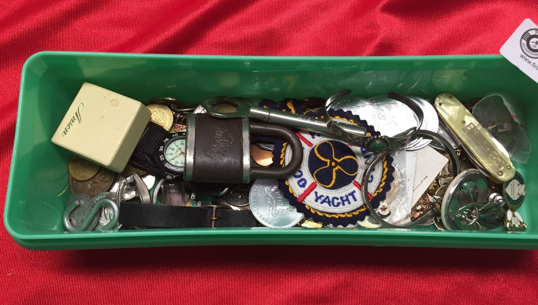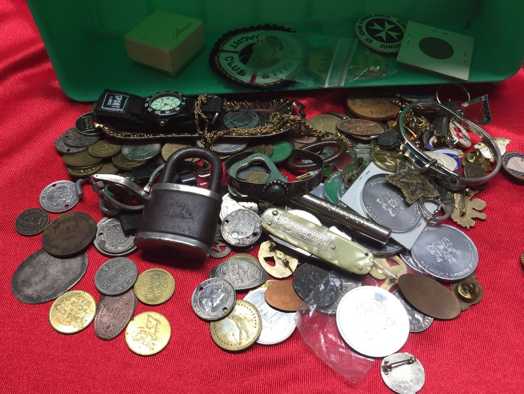 Miscellaneous Lot of Knives, Locks Watches, Tokens. Pins etc