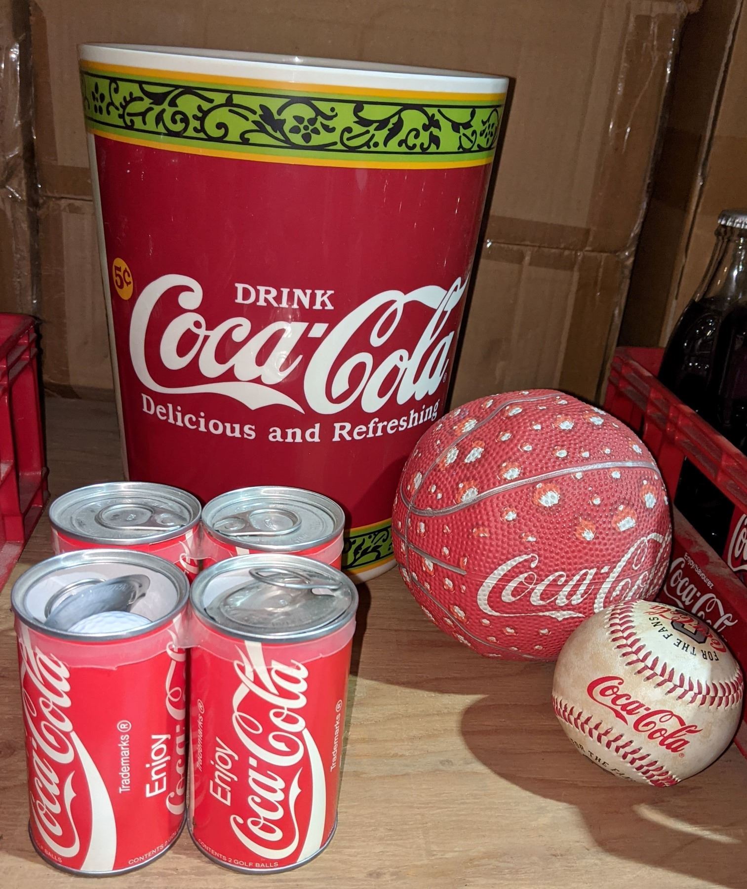 Miscellaneous collectible Coca Cola sports items, golf balls, and a bucket