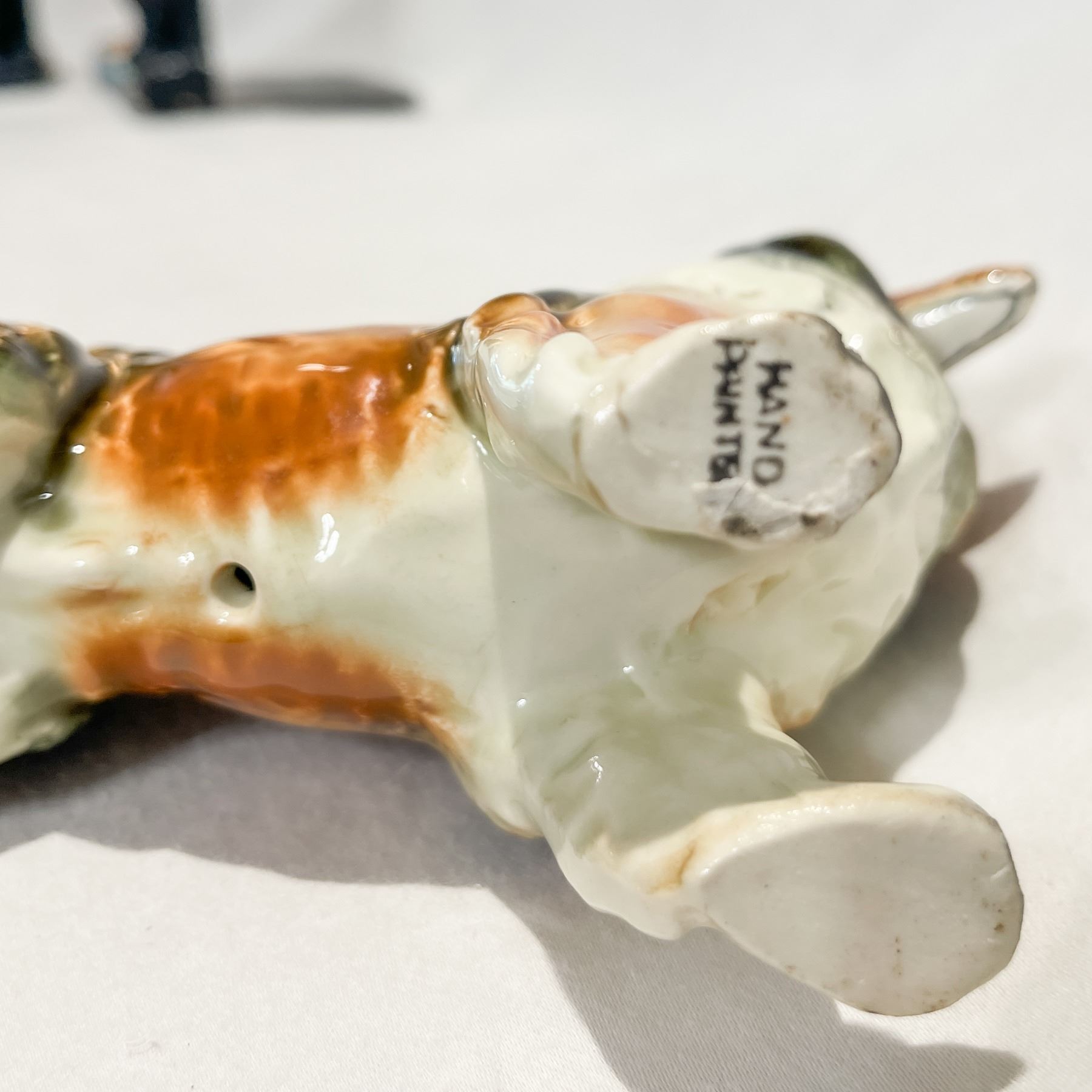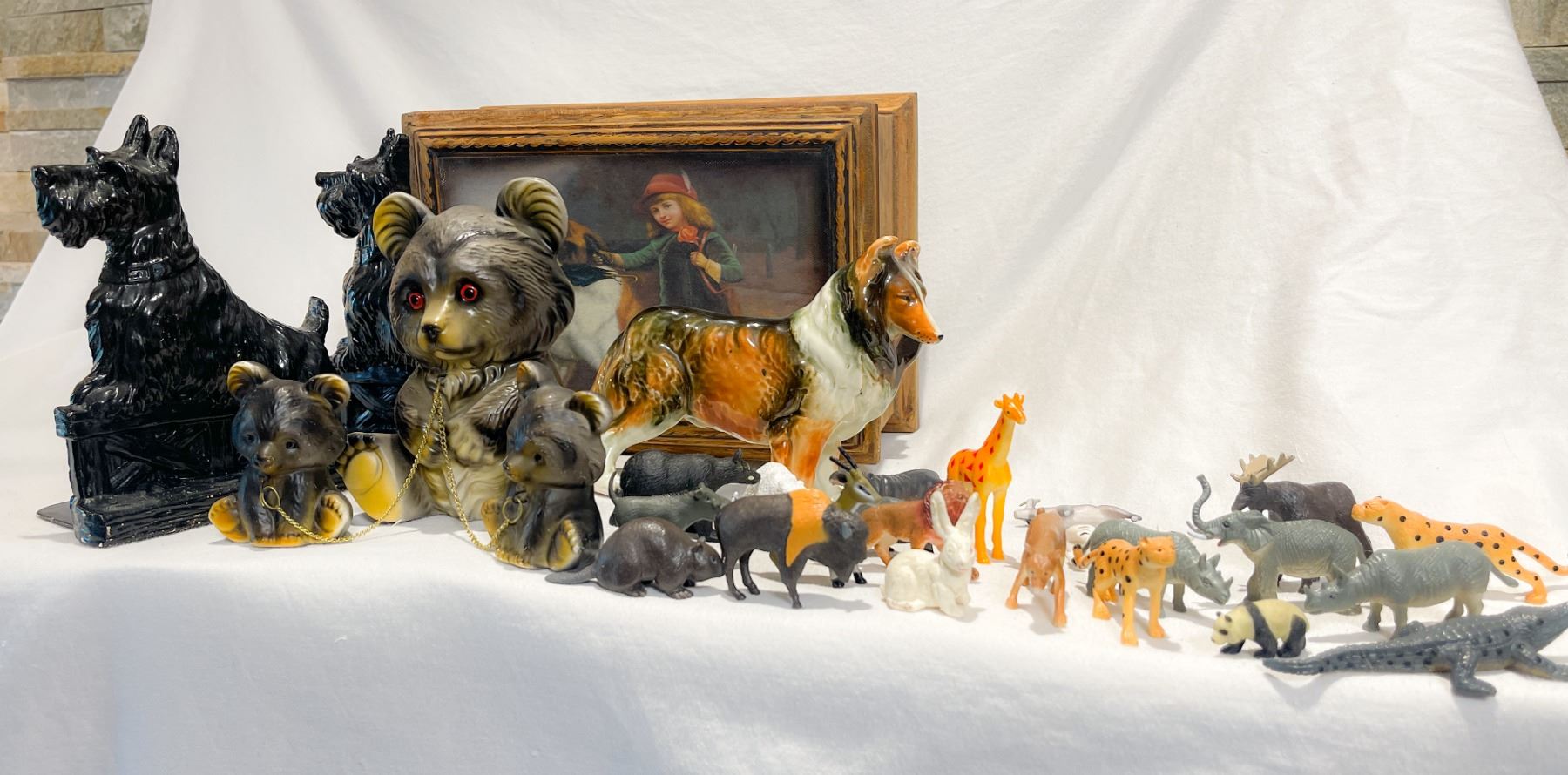 Eclectic collection of animal-themed items including black Scottie dog bookends, a ceramic Collie/Lassie figurine, and an unusual Japan-made bear with chained cubs. Also includes a wooden box with girl-and-dog image and a variety of small vintage plastic animal figures