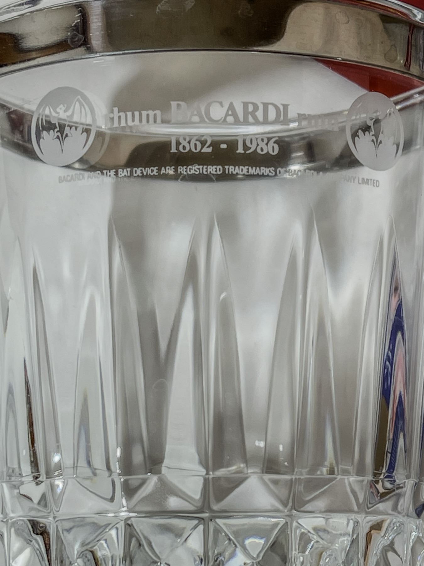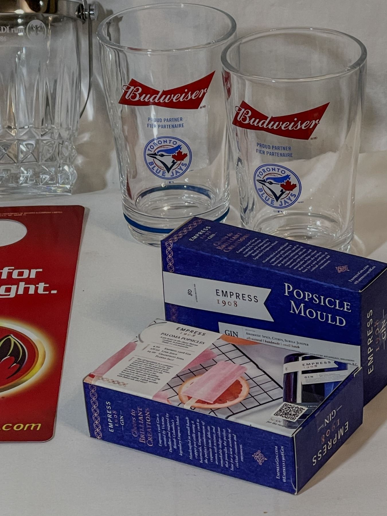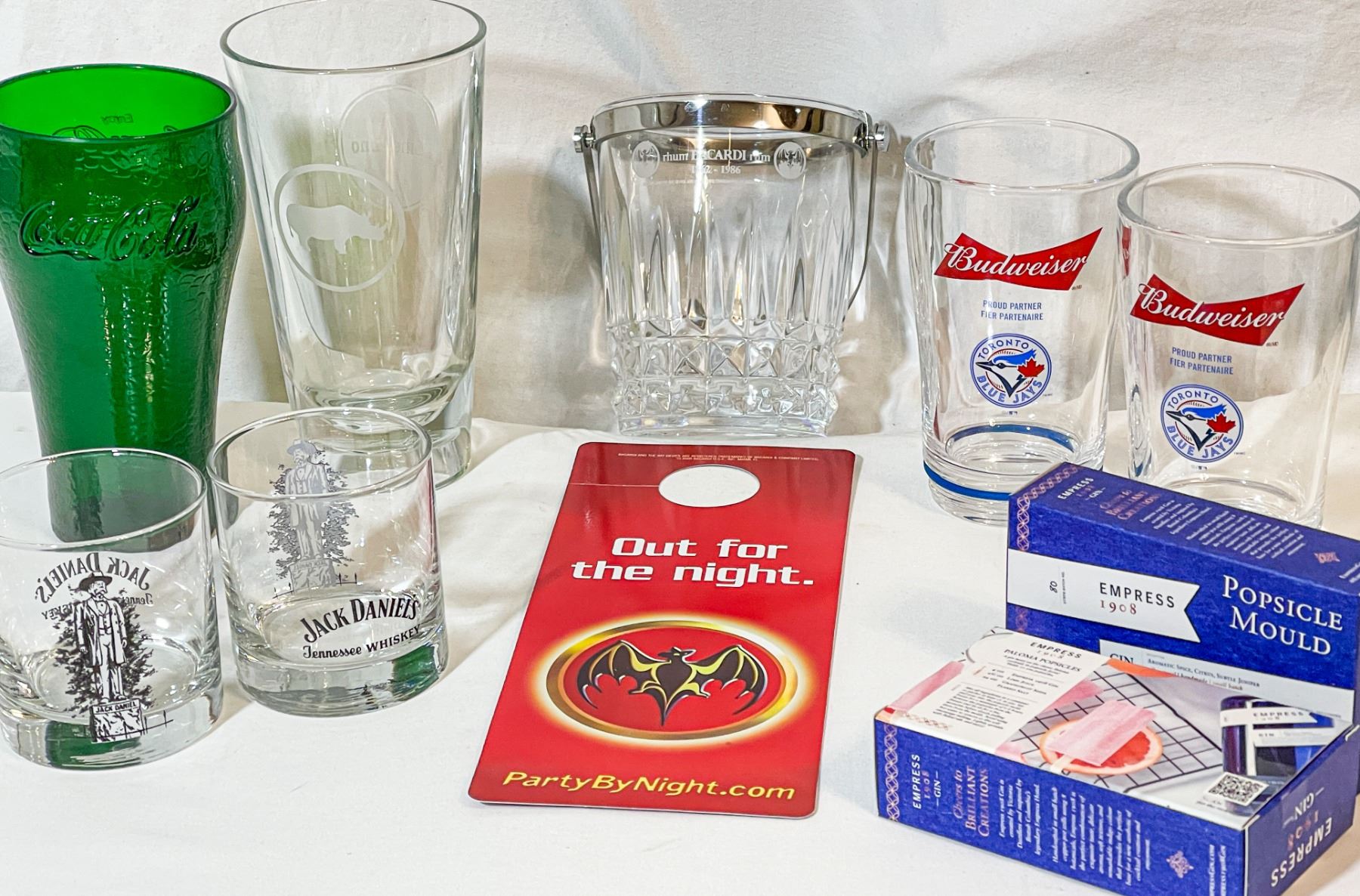 Fun collection of branded barware and accessories including: Budweiser/Toronto Blue Jays pint glasses, a commemorative Bacardi 1862–1986 crystal ice bucket, “Albino Rhino” Earls on Top glass, Jack Daniels lowball tumblers, vintage green Coca-Cola plastic cup, Bacardi “Out for the Night” door hanger, and new Empress 1908 Gin popsicle molds. Great mix for collectors or home bar enthusiasts.
