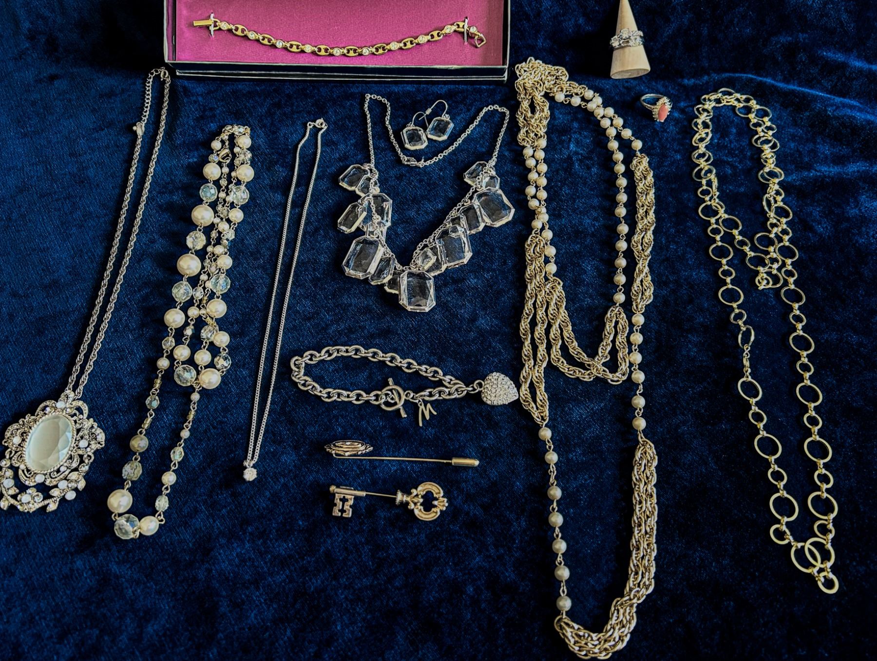 Assorted costume jewelry lot featuring a variety of vintage and modern pieces, including multiple Avon items and a matching crystal necklace and earring set.