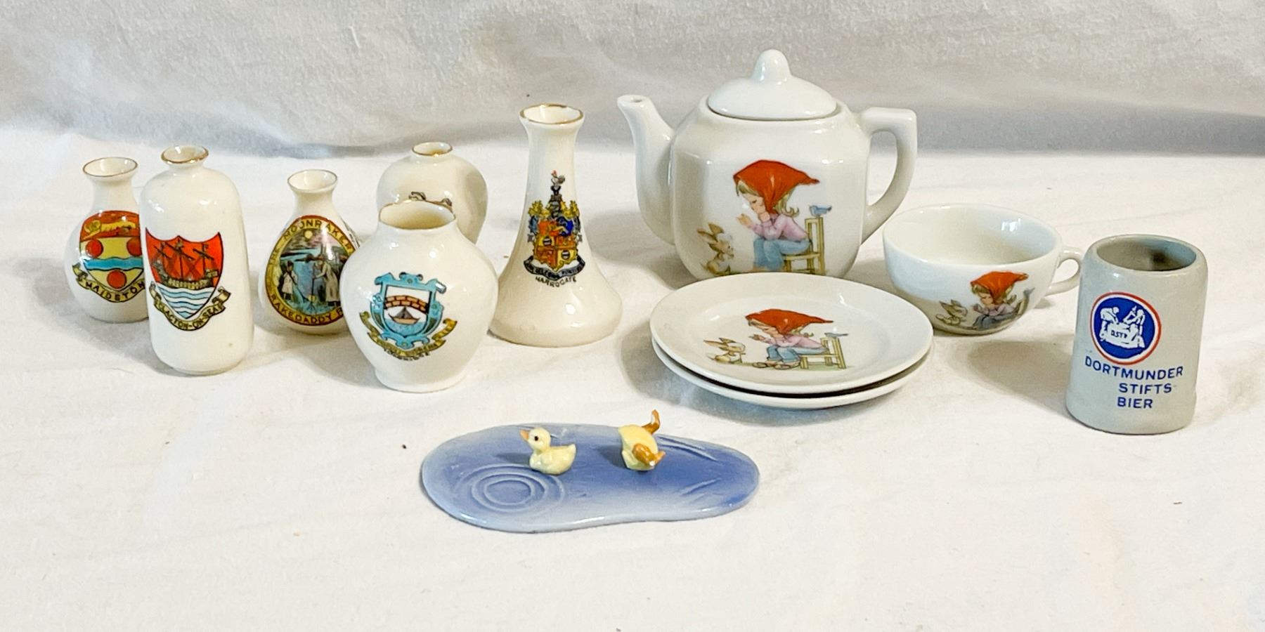 Charming mixed lot of miniatures including English souvenir crested ware vases, a small nursery tea set with Little Red Riding Hood motif, a tiny German beer stein, and a porcelain duck pond figurine.