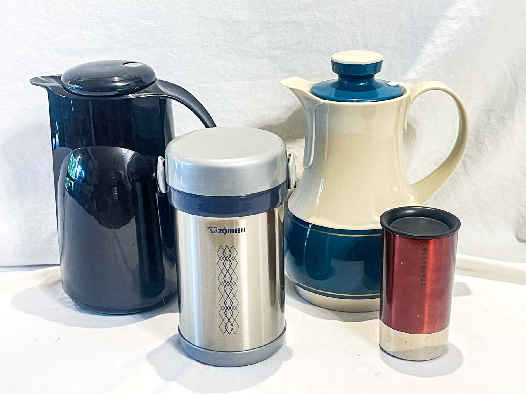 Set includes two larger Thermos brand carafes , a stainless steel Zojirushi insulated food container, and a red stainless Starbucks travel tumbler. All pieces are clean and in good usable condition