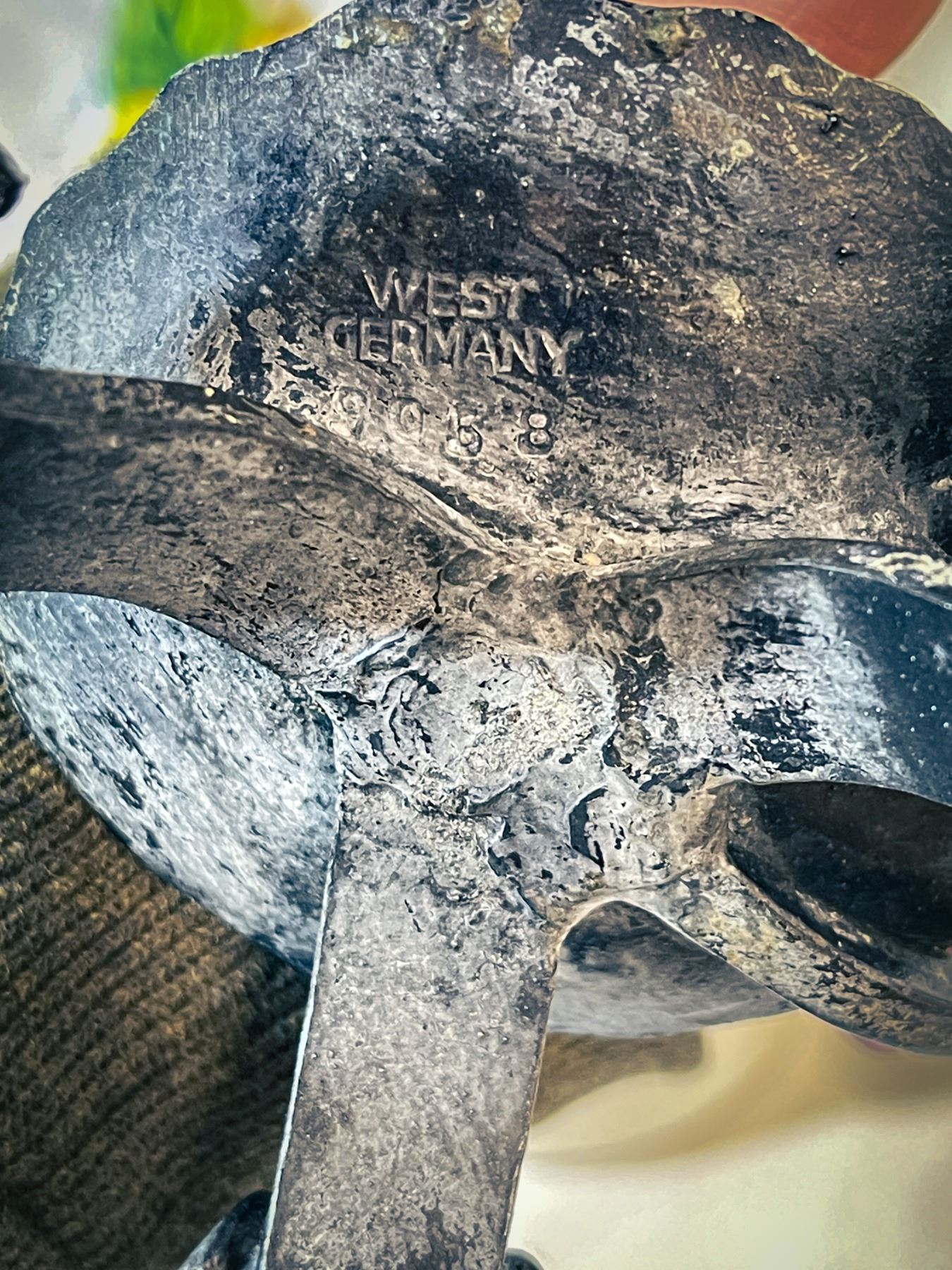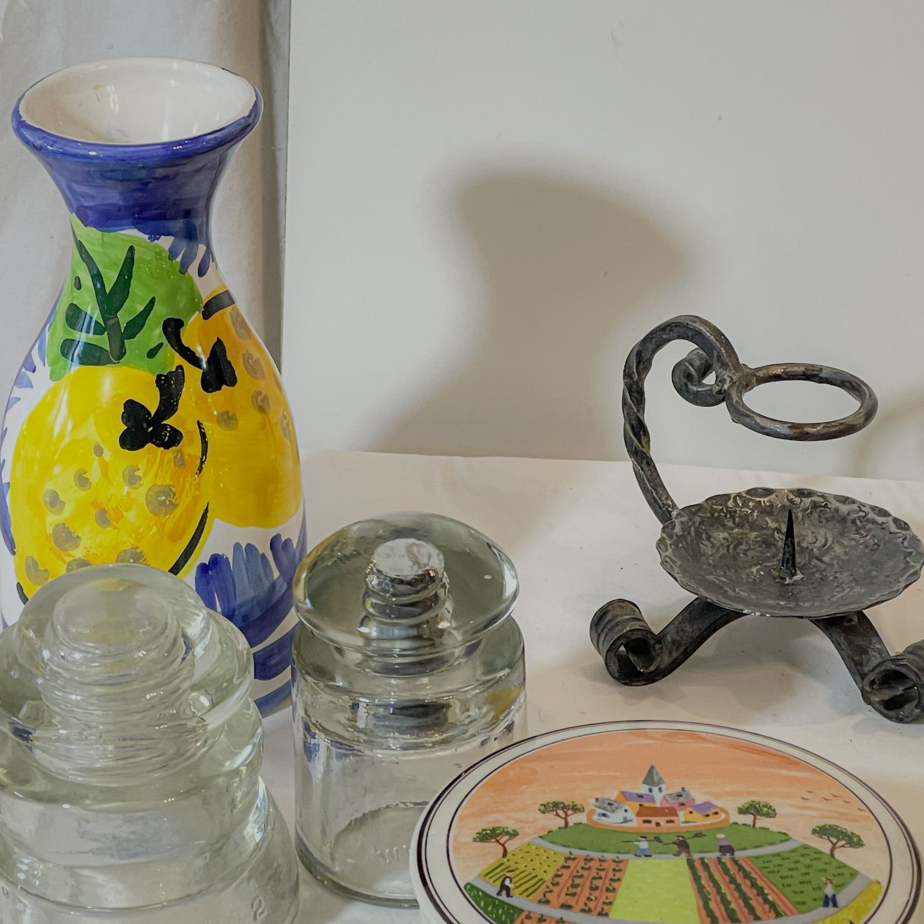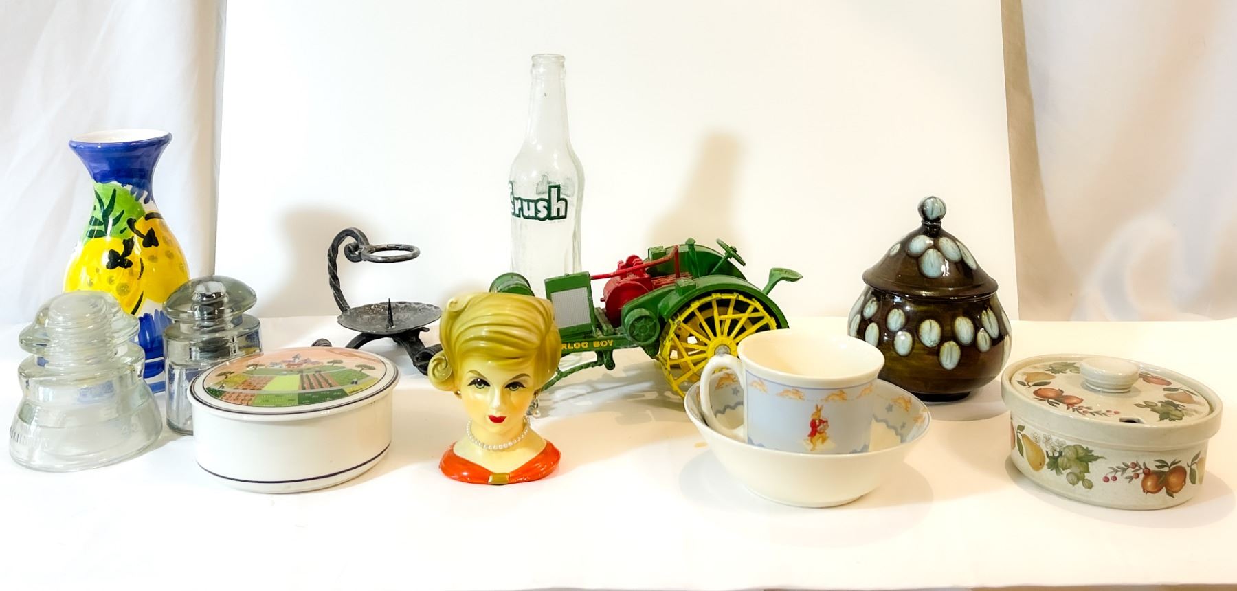 clectic assortment of vintage items including a Napcoware #4120 head vase (good condition, missing one earring), Bunnykins cup and bowl set (bowl chipped), and a Wedgewood “Quince” lidded dish. Also features a Villeroy & Boch Design Naïf trinket jar, Italian hand-painted vase, vintage Crush soda bottle, diecast John Deere Waterloo Boy tractor (missing front wheels), pair of vintage glass insulators, wrought iron West German candle holder, and hobbyist-painted pottery jar. A charming mix of mid-century and vintage collectibles, all in good used condition with noted imperfections.