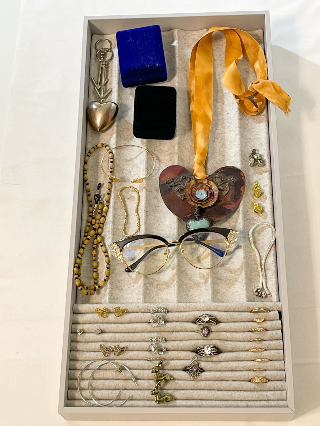 Eclectic assortment of vintage and costume jewellery, including rings, earrings, bracelets, and a pair of mid-century style cat-eye glasses. Features a handmade heart pendant necklace on a golden ribbon, plus assorted vintage pieces in both silver and gold tones. Comes neatly arranged in an IKEA jewellery display tray.