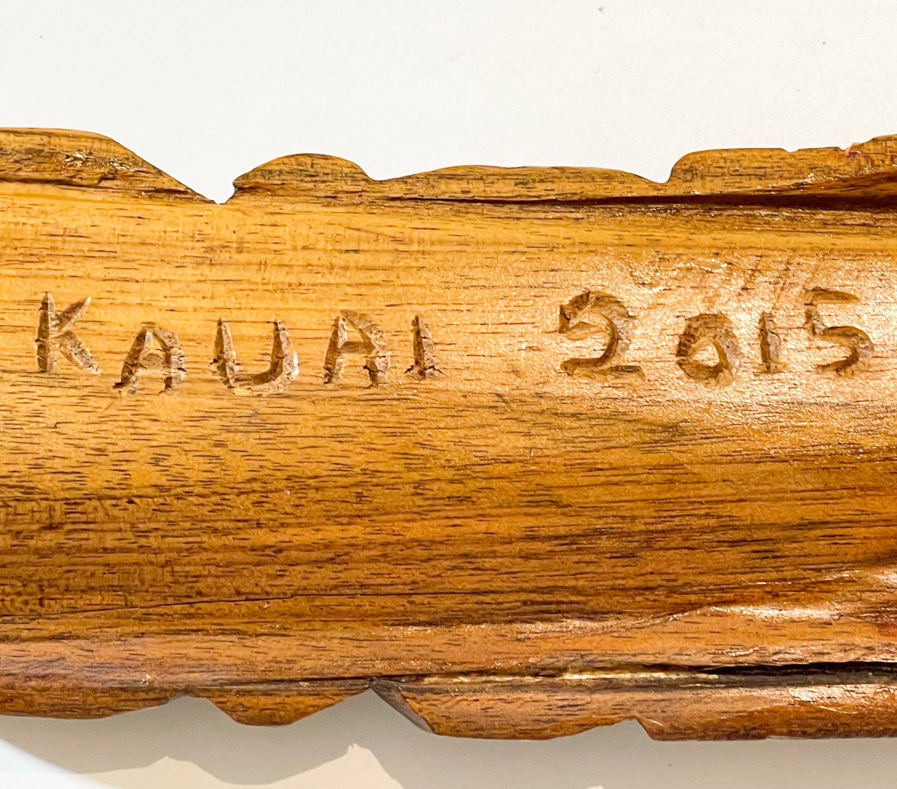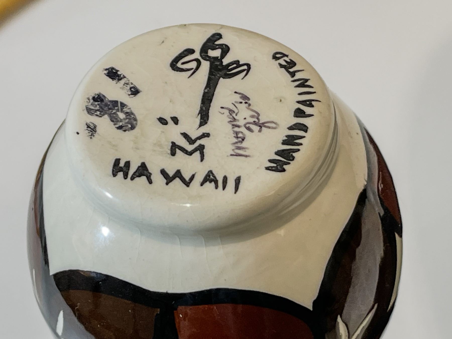 Eclectic mid-century and island-inspired lot including a Treasure Craft Maui No.15 green ceramic ashtray, a hand-carved tiki totem signed “Kaui 2015”, a hand-painted Hawaii vase , a dark wood sculptural tray, and two pairs of vintage bamboo purse handles (four total even though only 3 in photo). A striking mix of Hawaiian /tiki decor pieces.