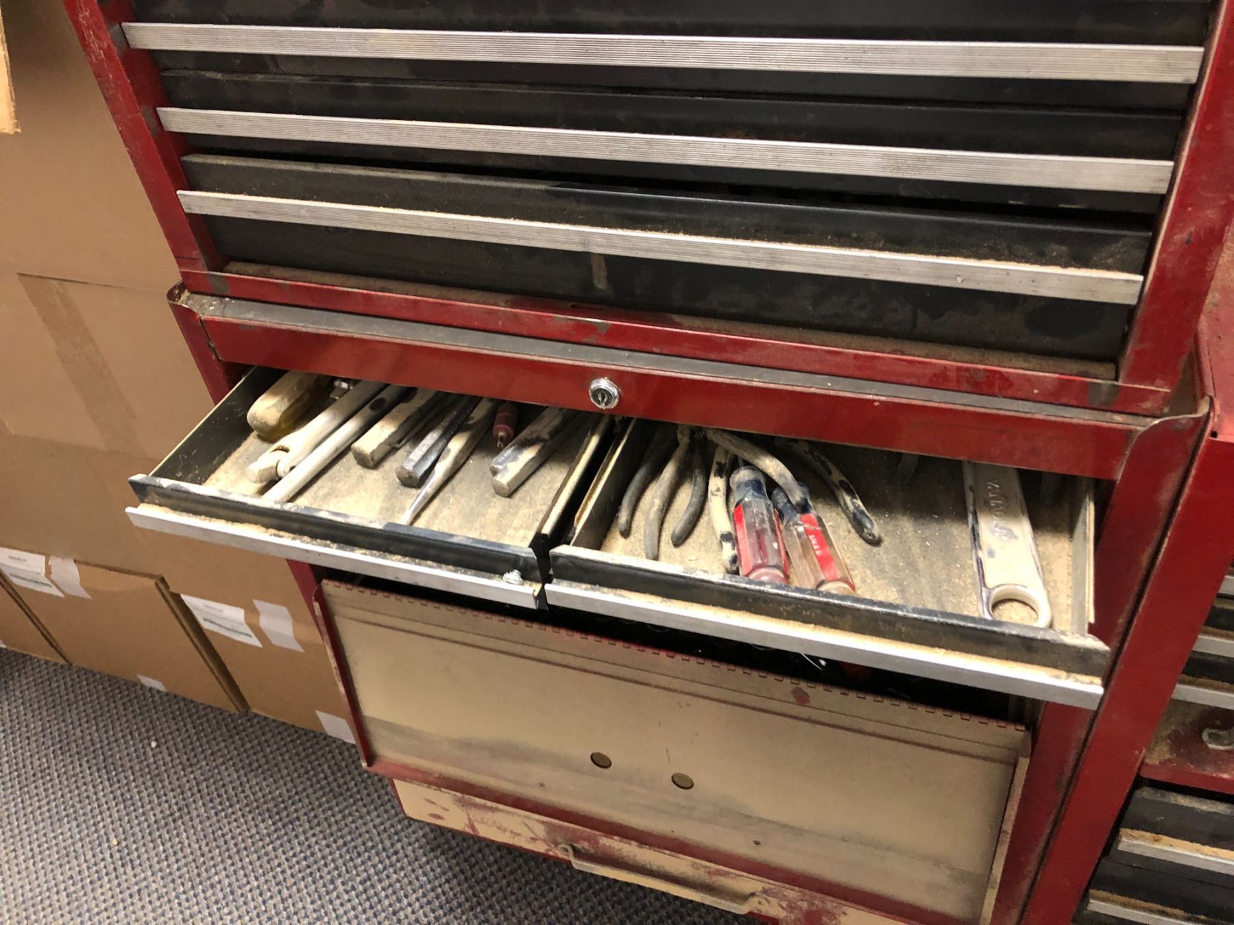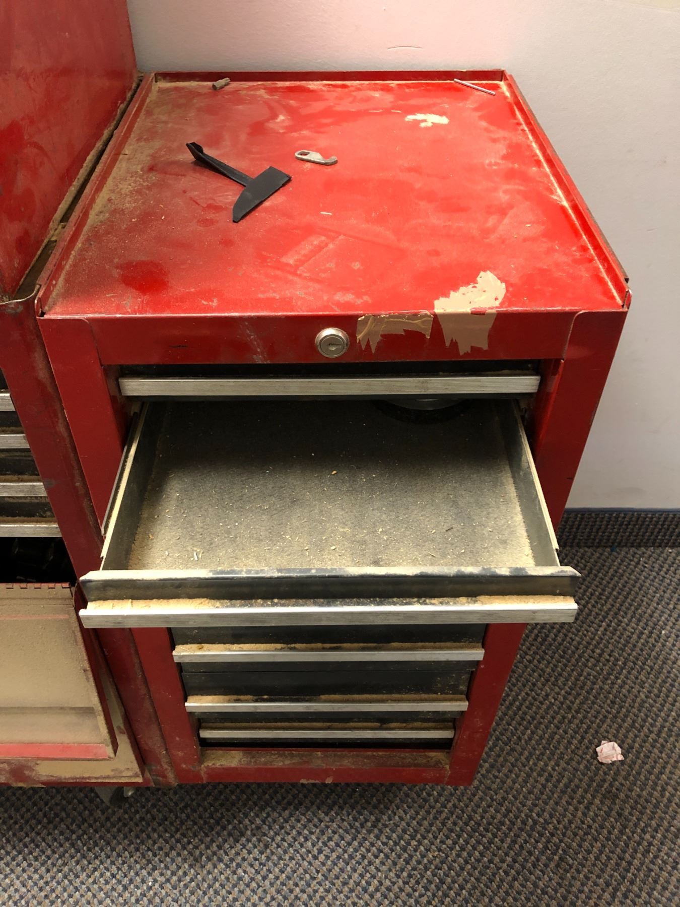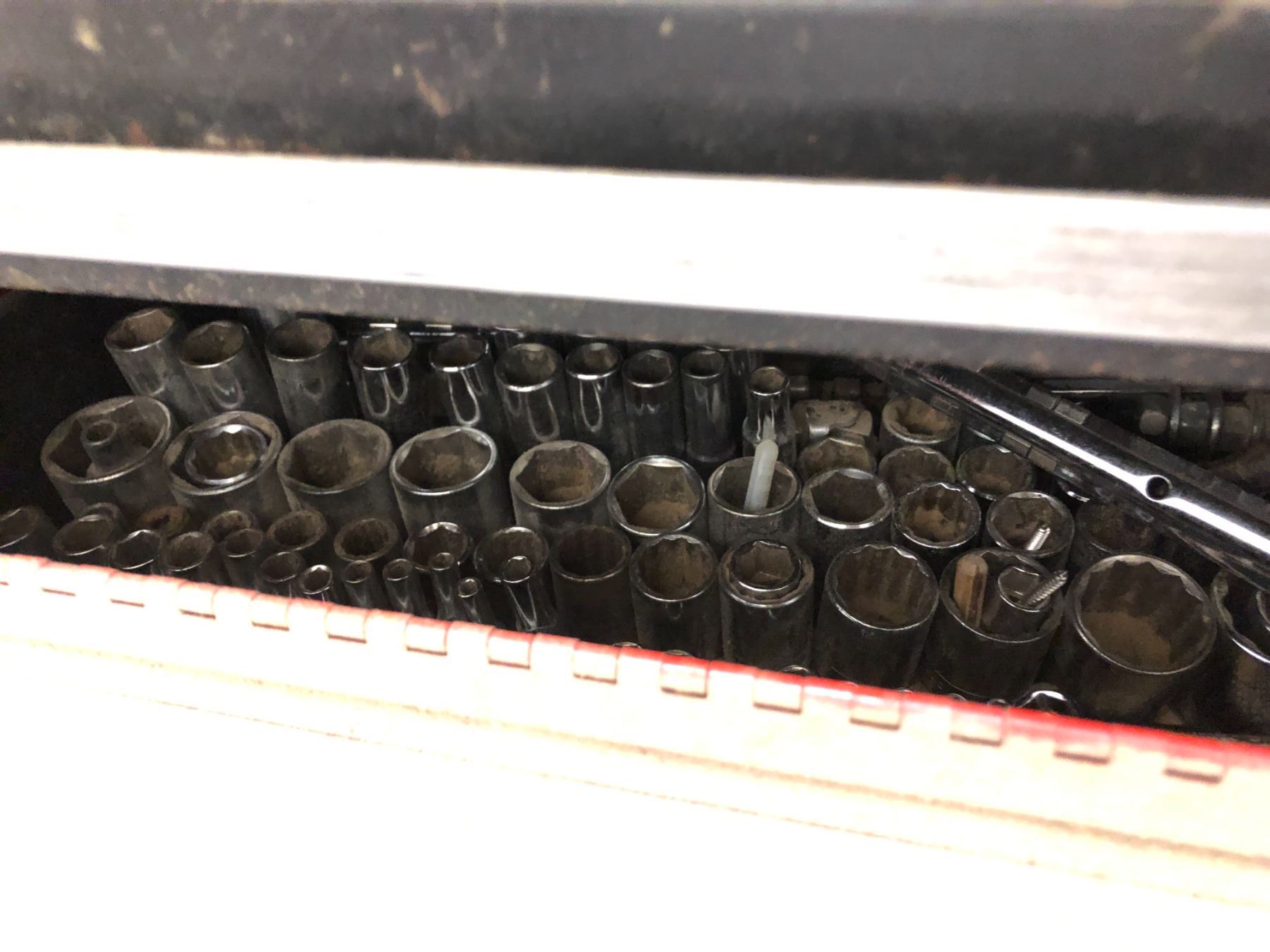 Mobile red mechanics toolbox on casters - includes set of sockets etc