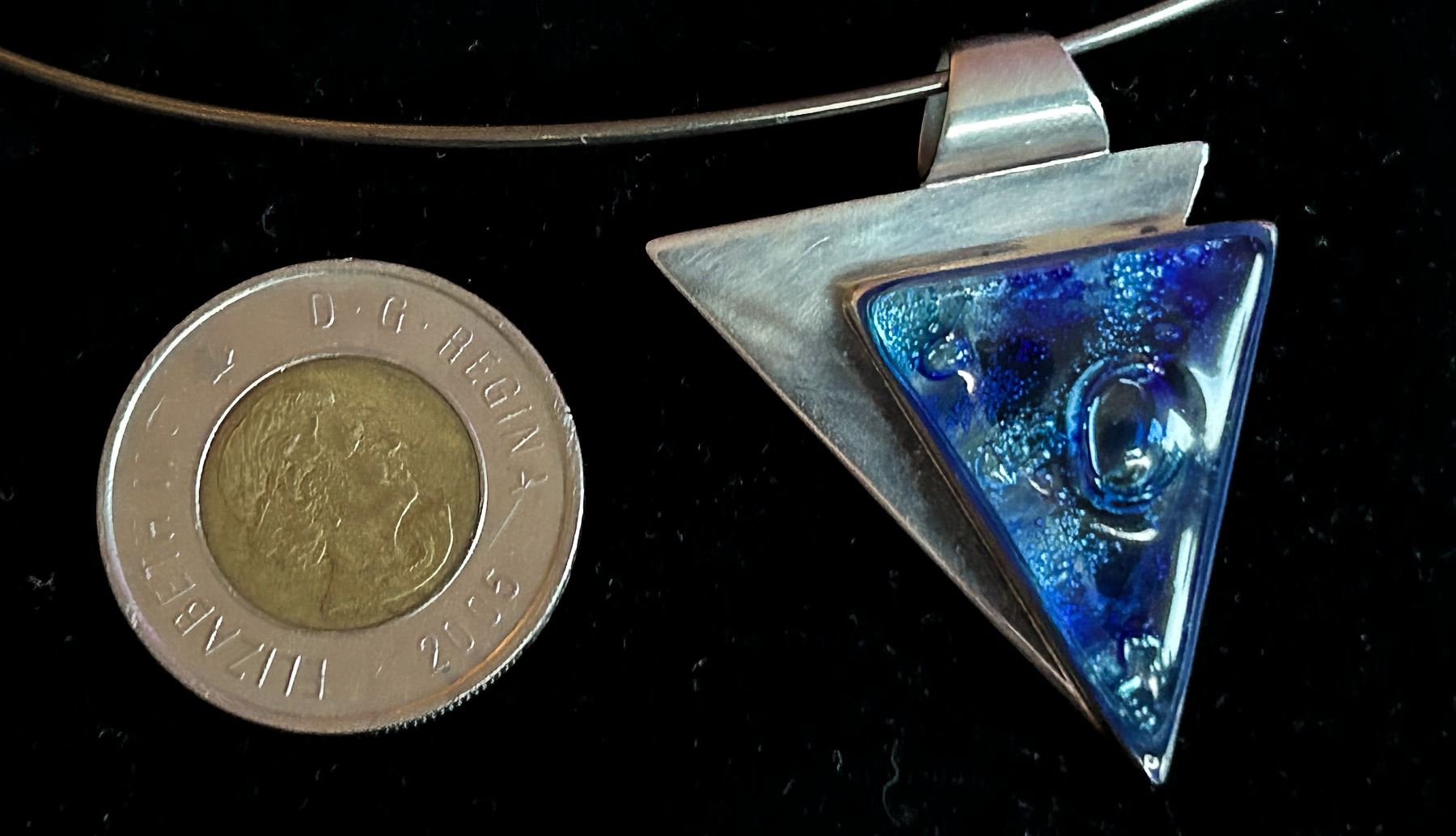 Striking geometric pendant crafted in sterling silver, featuring a vibrant blue fused glass centerpiece with dimensional bubbles and textural detail. Marked 925. Pendant only—wire choker and toonie shown for scale, not included.