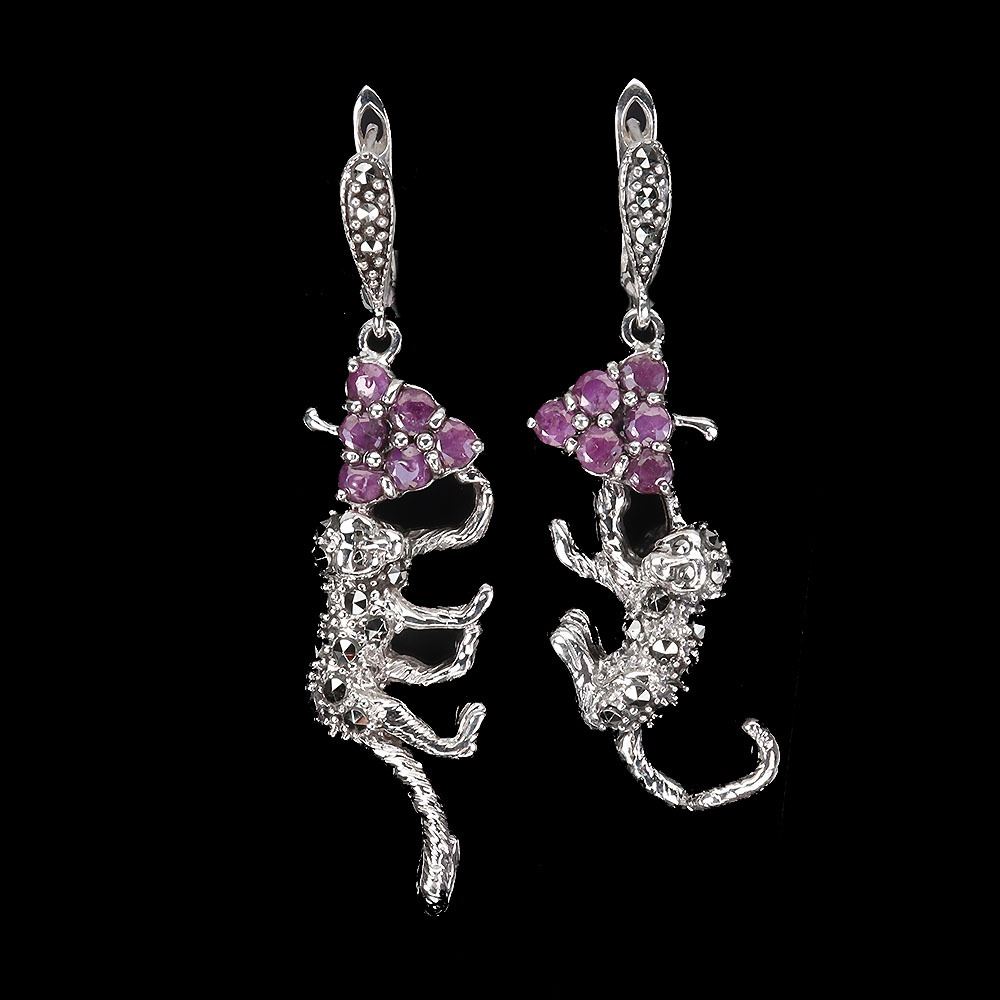 Monkey Shaped RUBY and MARCASITE EARRINGS in 14K White Gold plated 925 Sterling Silver – Appraised Replacement Value CAD 540
