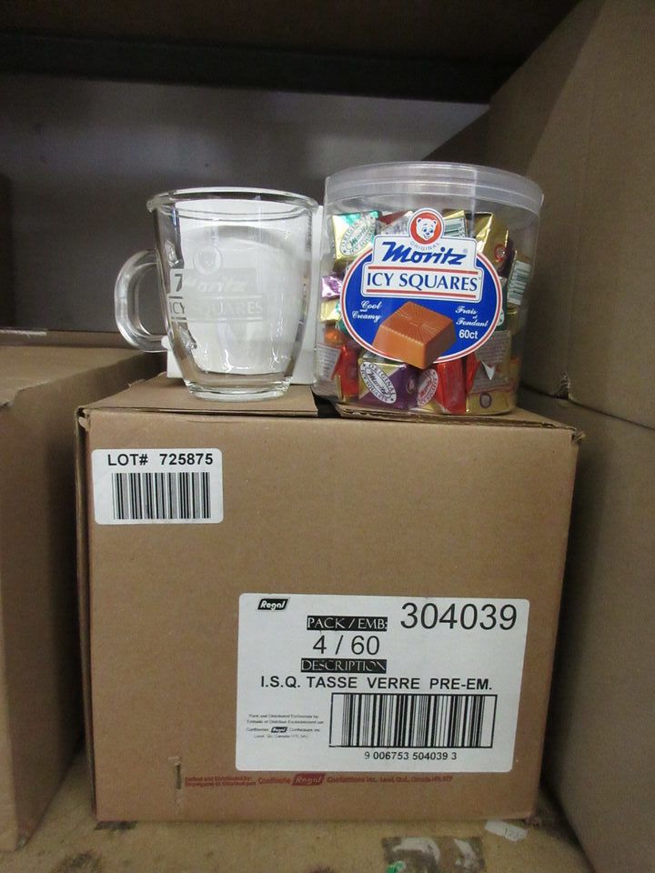 4 x 660 gram tubs of 60 icy square chocolates. 2 Latte mugs with frosted Moritz Icy Squares logo.