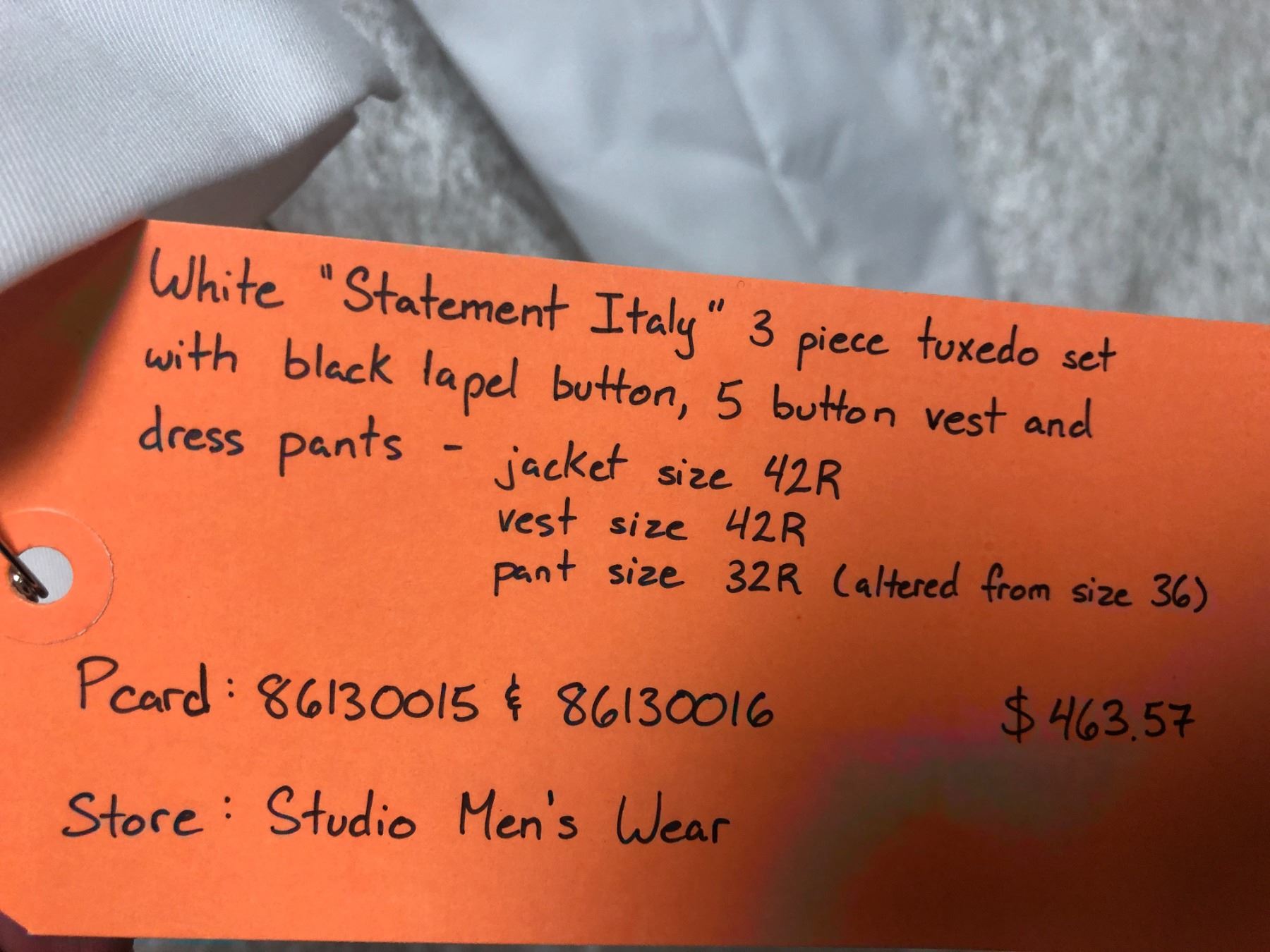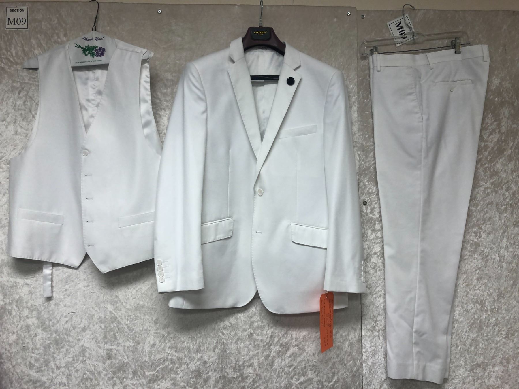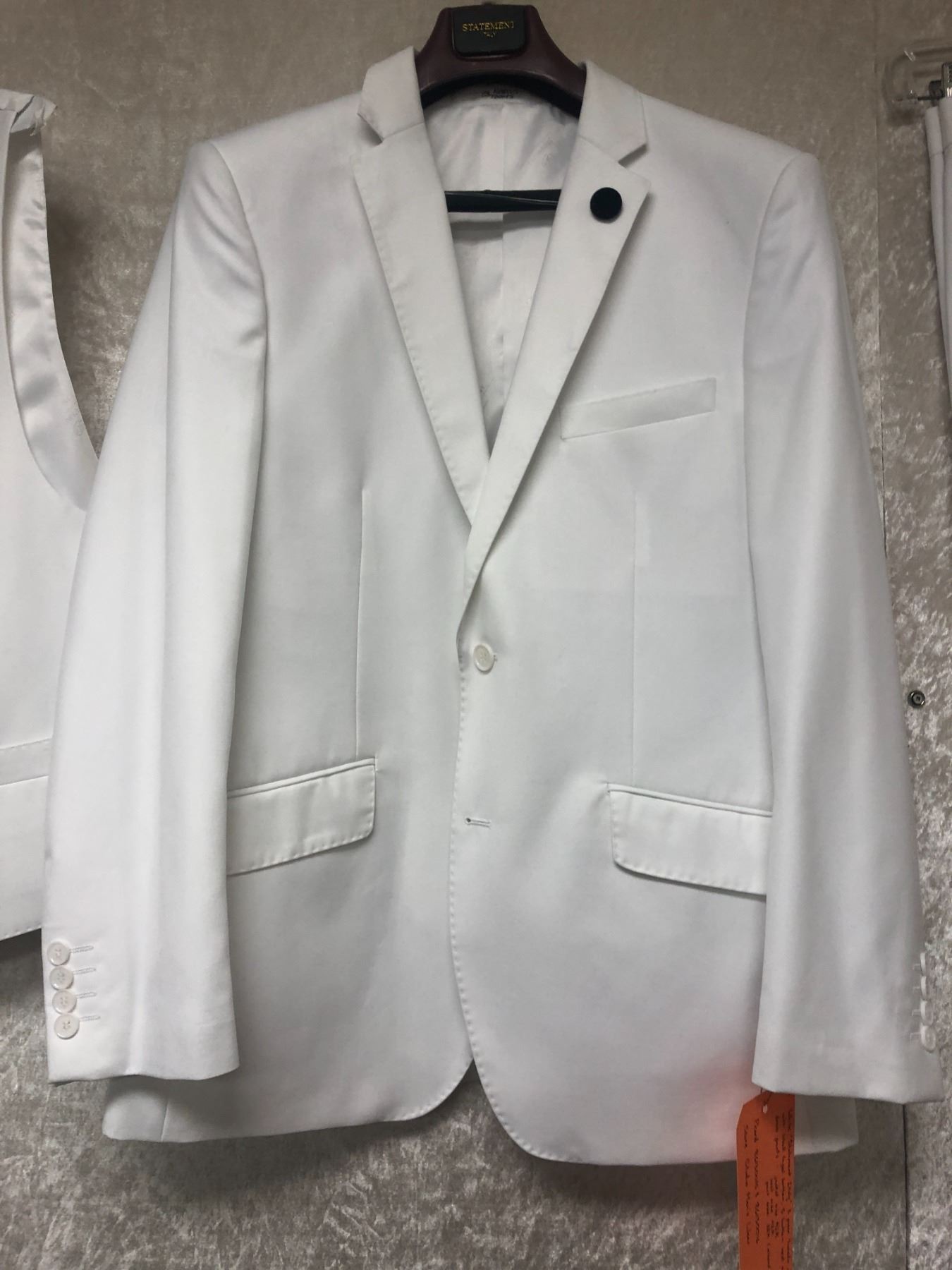 "Motherland: Fort Salem" - "#93 Marcus Tooms" White "Statement Italy" 3 pc tuxedo set with black lapel button/5 button vest & dress pants - Jacket 42R/Vest 42R & pant 32R.