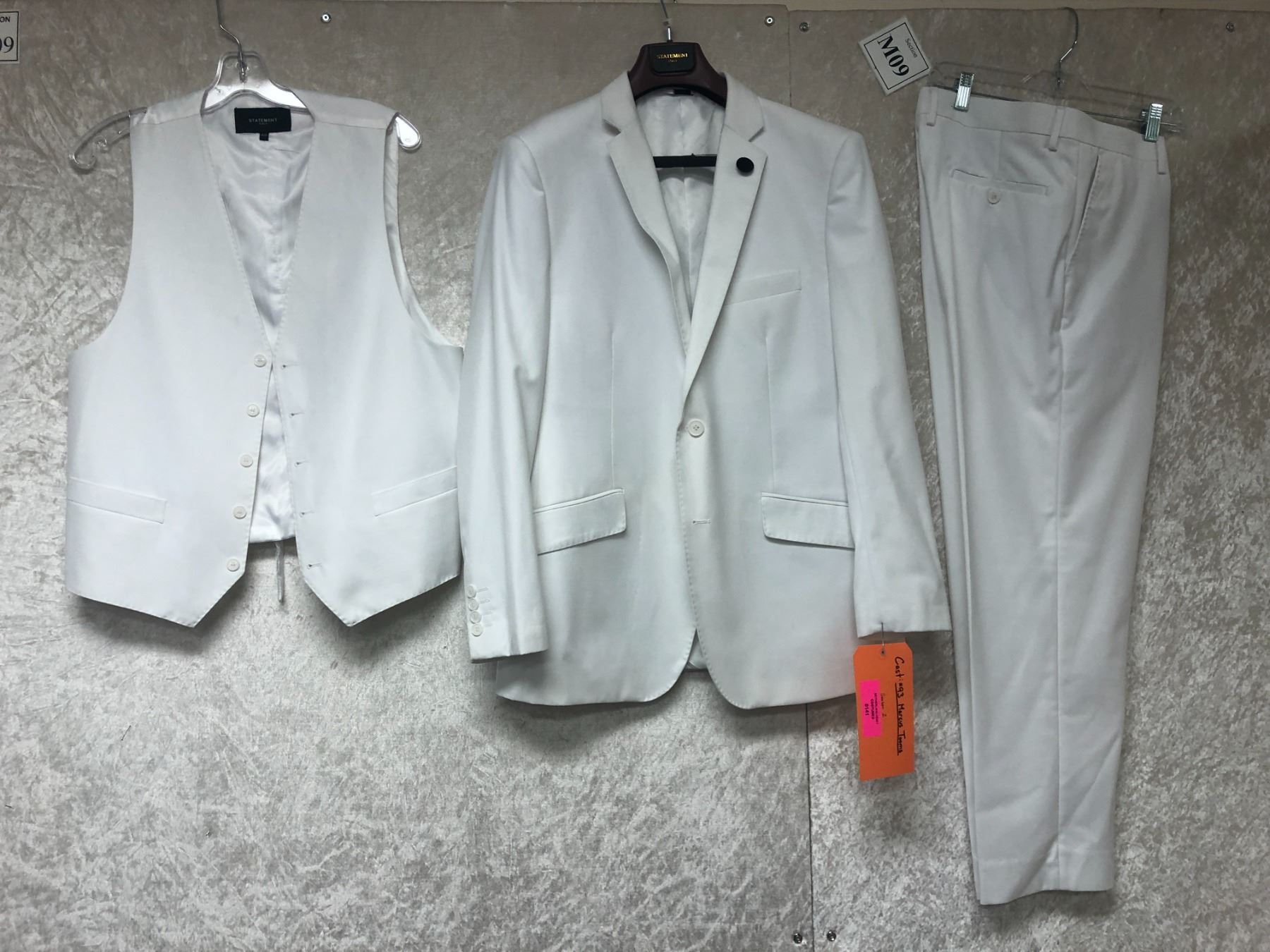 "Motherland: Fort Salem" - "#93 Marcus Tooms" White "Statement Italy" 3 pc tuxedo set with black lapel button/5 button vest & dress pants - Jacket 42R/Vest 42R & pant 32R.