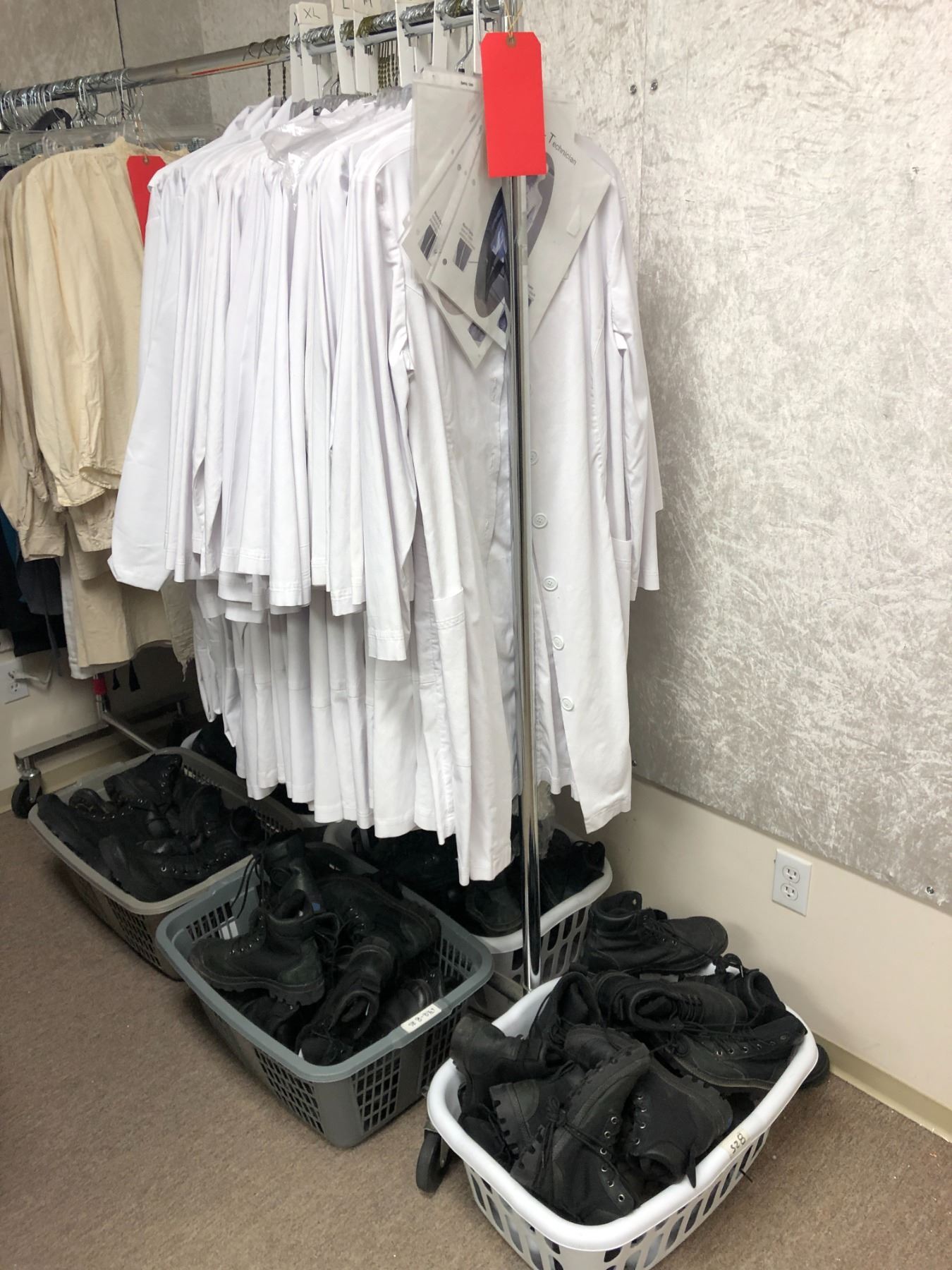 "Motherland: Fort Salem" - Approx. 44 pcs of lab-technician coats & approx. 30 pairs of black boots (missing black pants & spats)