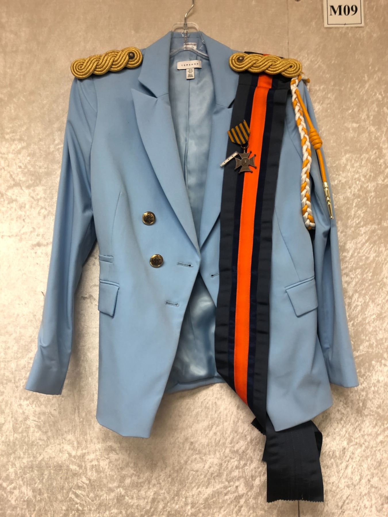 "Motherland: Fort Salem" - "Netherlands Michelle" Blue Military outfit w/accessories 5 pc set - includes shirt/shoulder emblems/French fourragère & sash w/badges