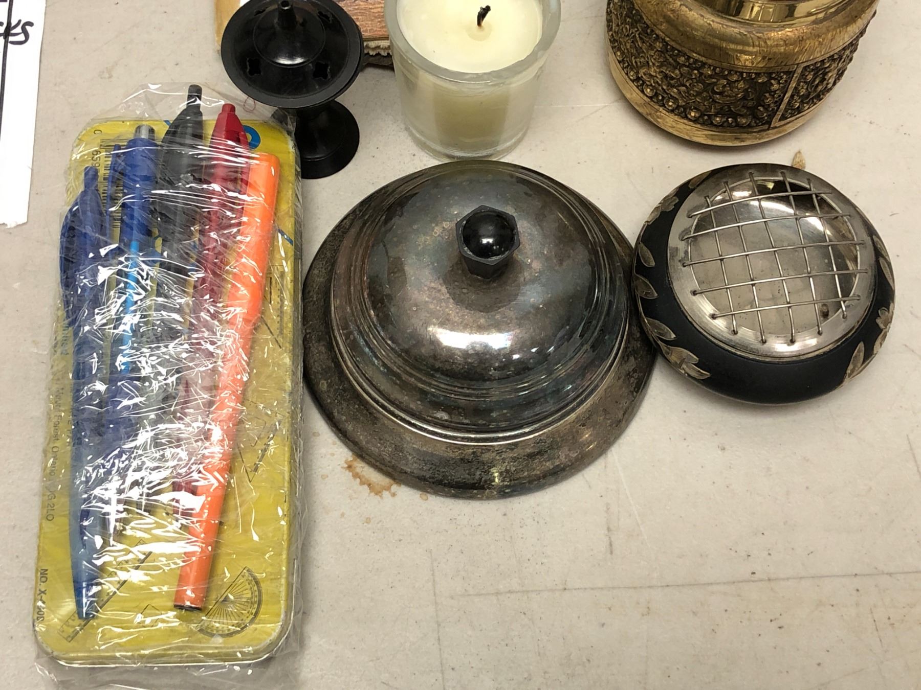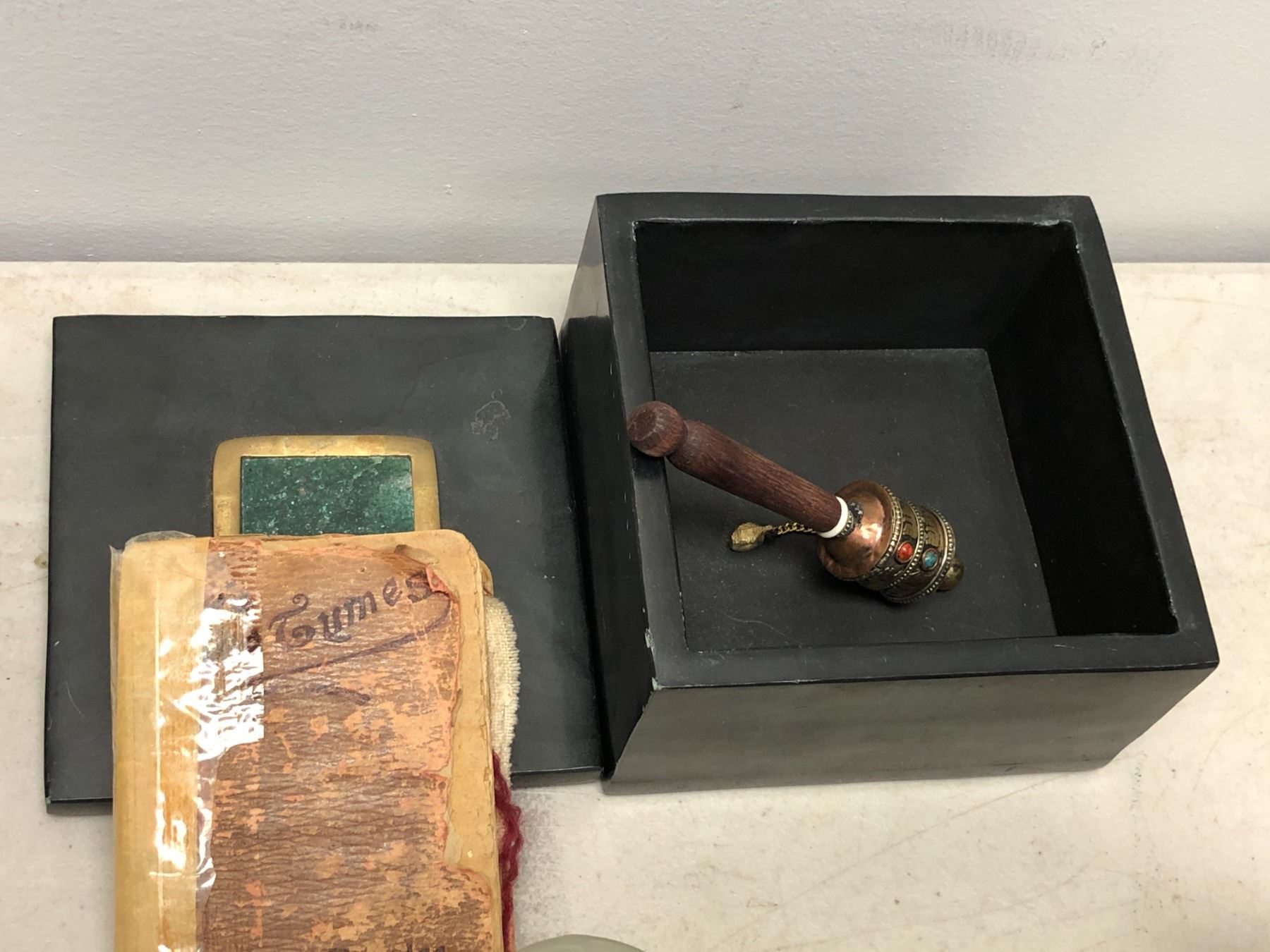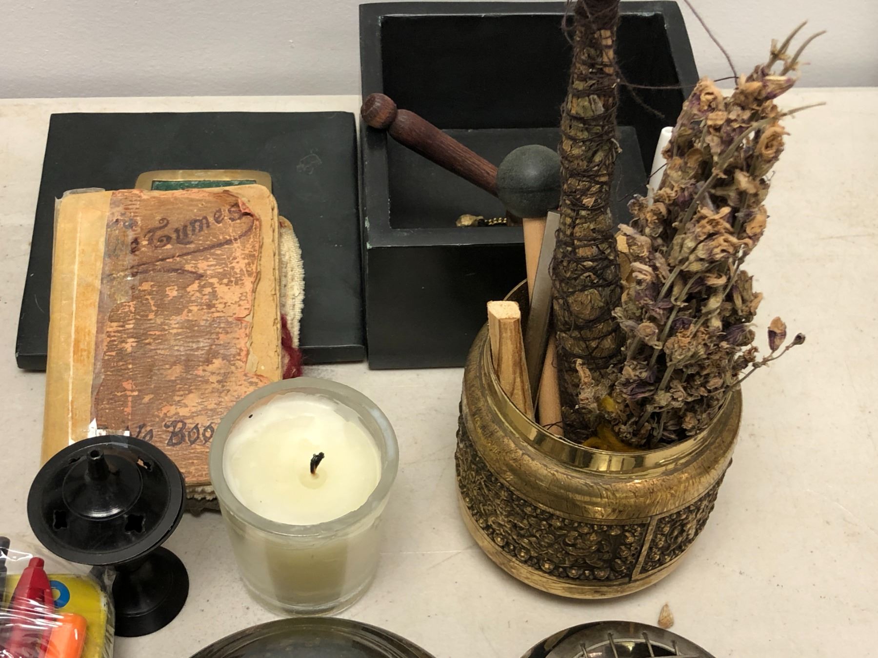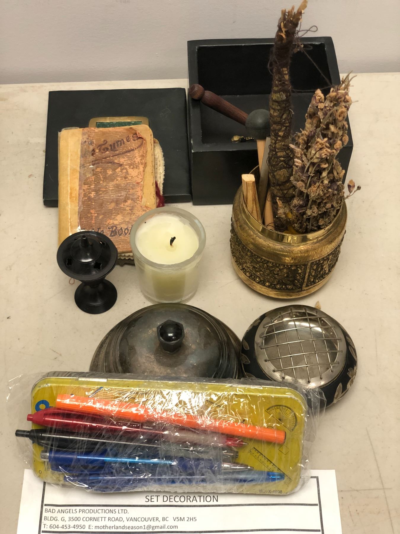 "Motherland: Fort Salem" Scylla's Room - Black marble box/ metal bell/ jar w/ herbs/ small red book etc.