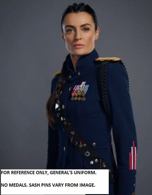 "Motherland: Fort Salem" - United States Army "General's" Dress Uniform 6pc set - includes jacket/ trousers/ white gloves/ shoulder rank emblems/ French fourragère & sash w/ assorted witches merit pins (5 stripes on sleeve)