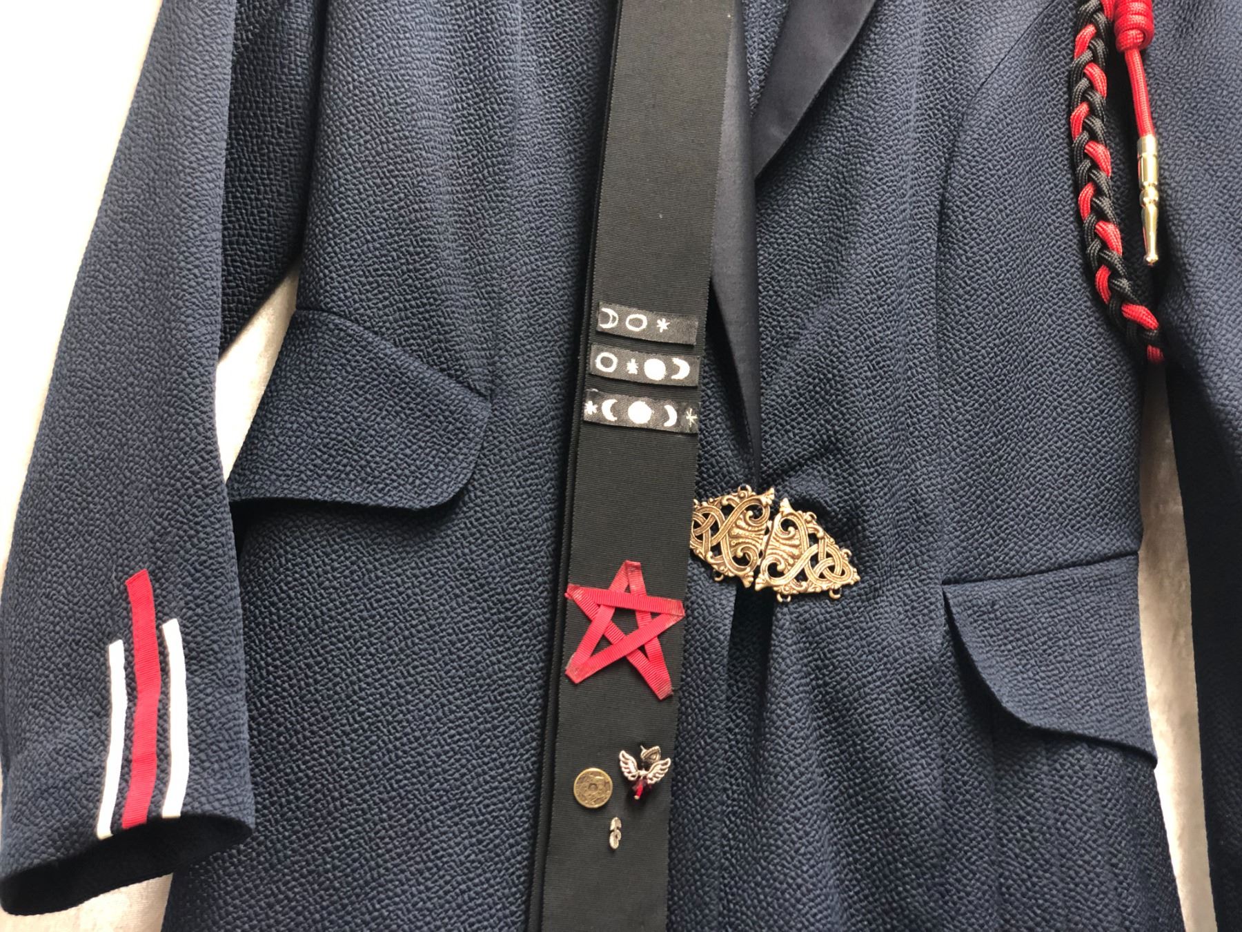 "Motherland: Fort Salem" - United States Army Long Coat 4pc set - includes long coat/ shoulder rank emblems/ French fourragère & sash w/ assorted witches merit pins (3 stripes on sleeve)
