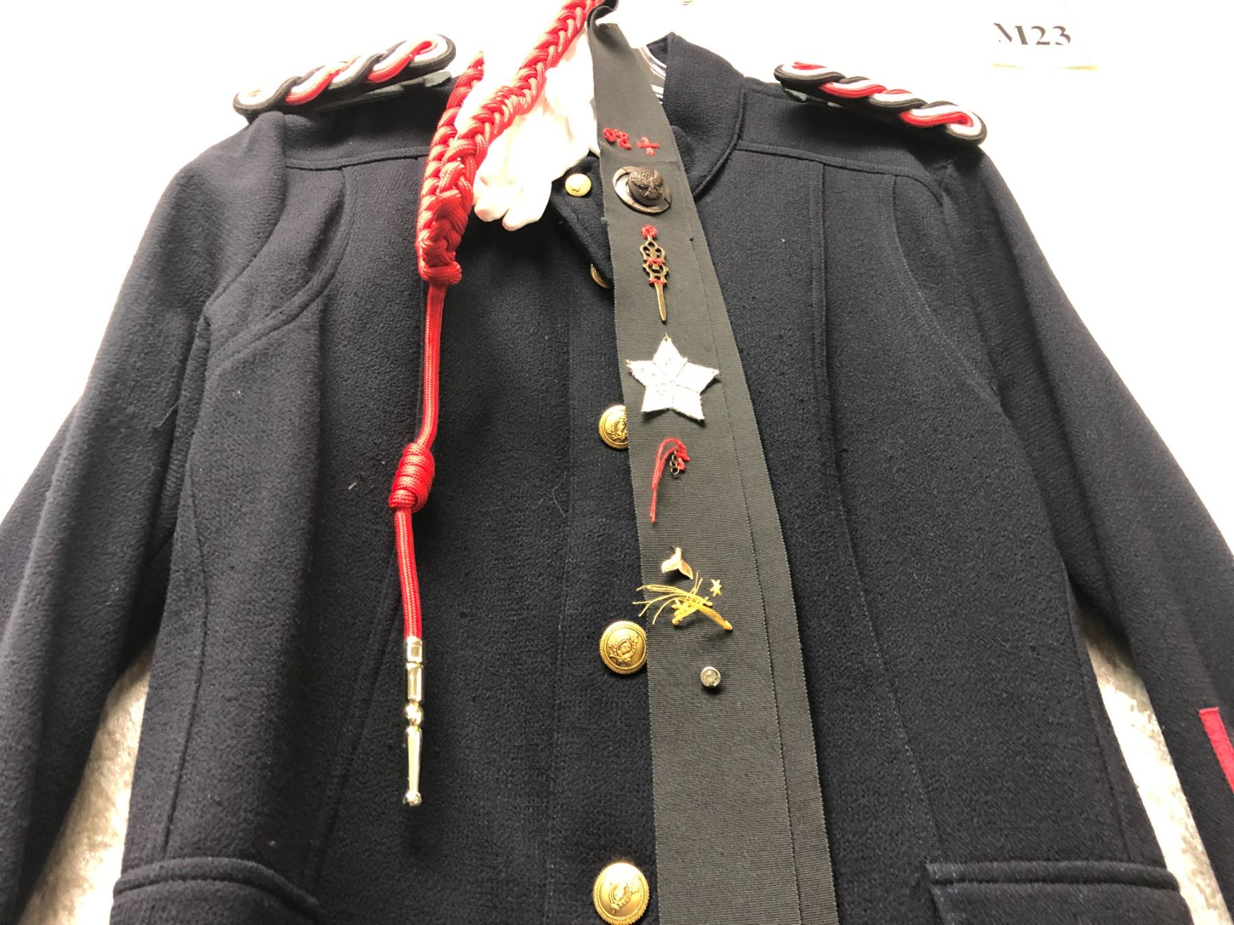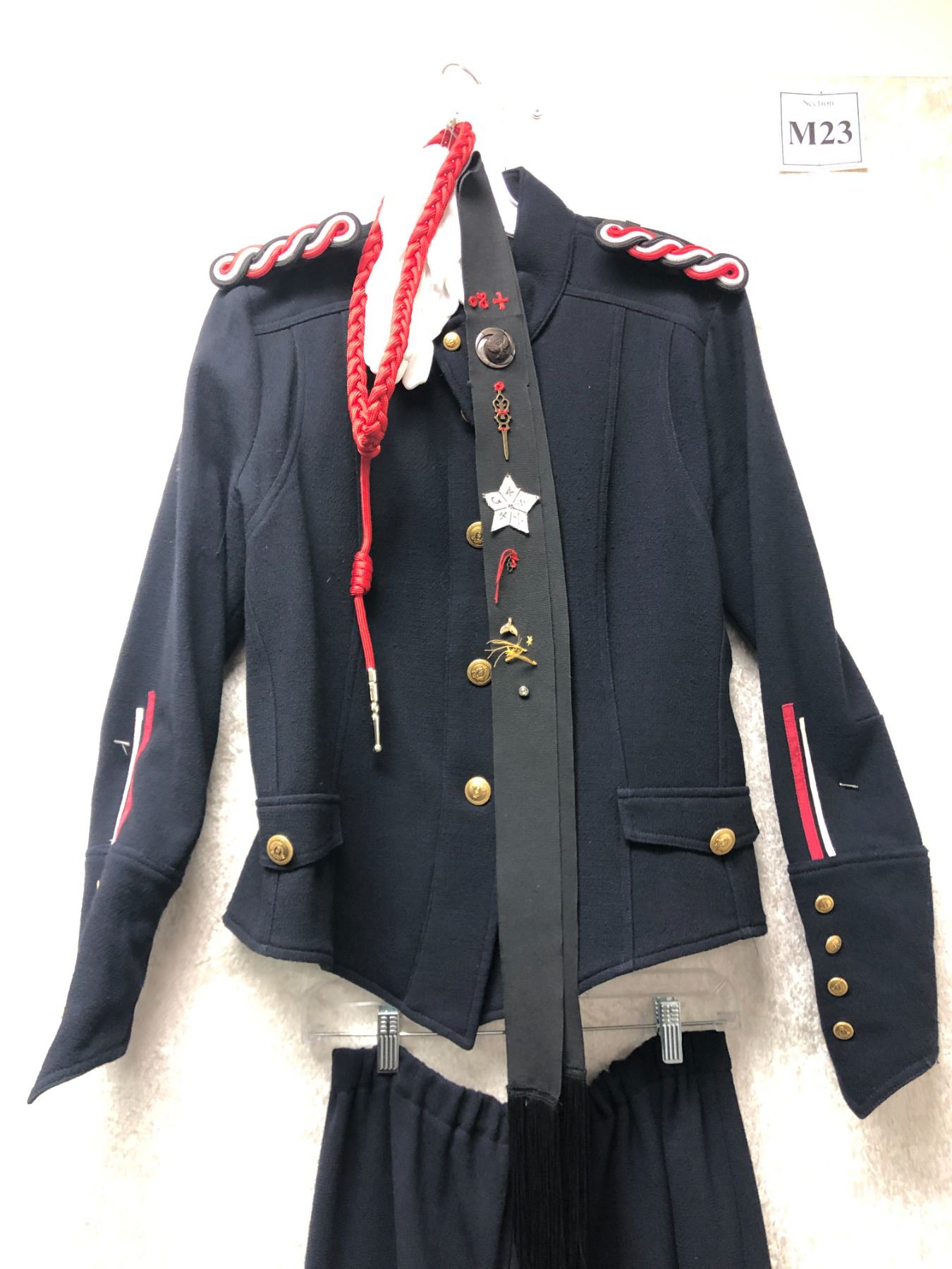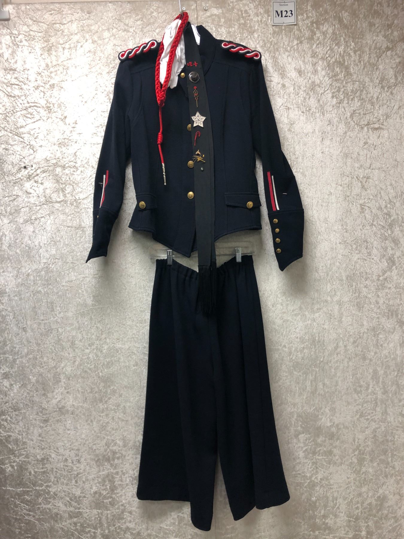 "Motherland: Fort Salem" - United States Army "Sergeant" Uniform 6pc set - includes jacket/ trousers/ white gloves/ shoulder rank emblems/ French fourragère & sash w/ assorted witches merit pins (2 stripes on each sleeve)