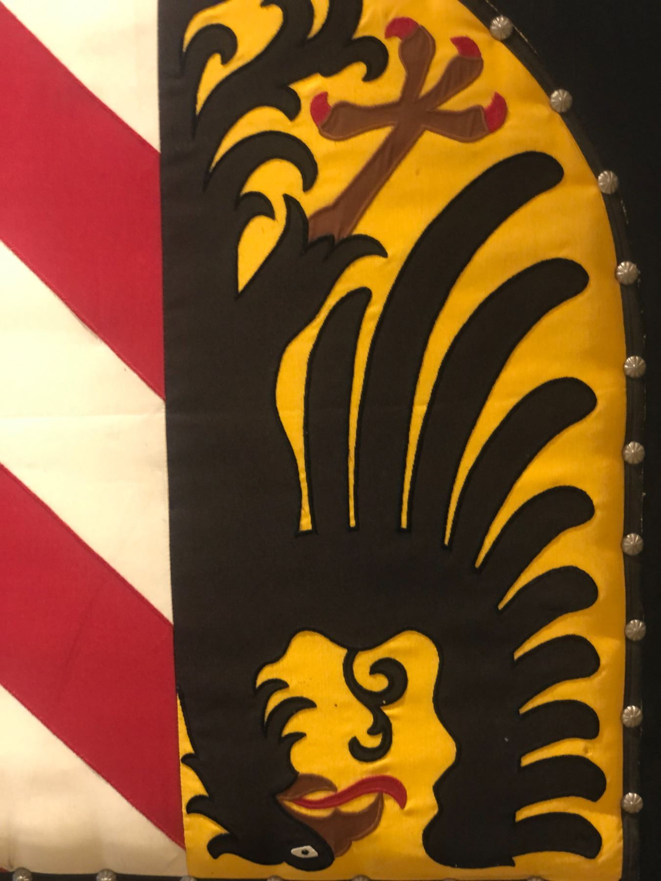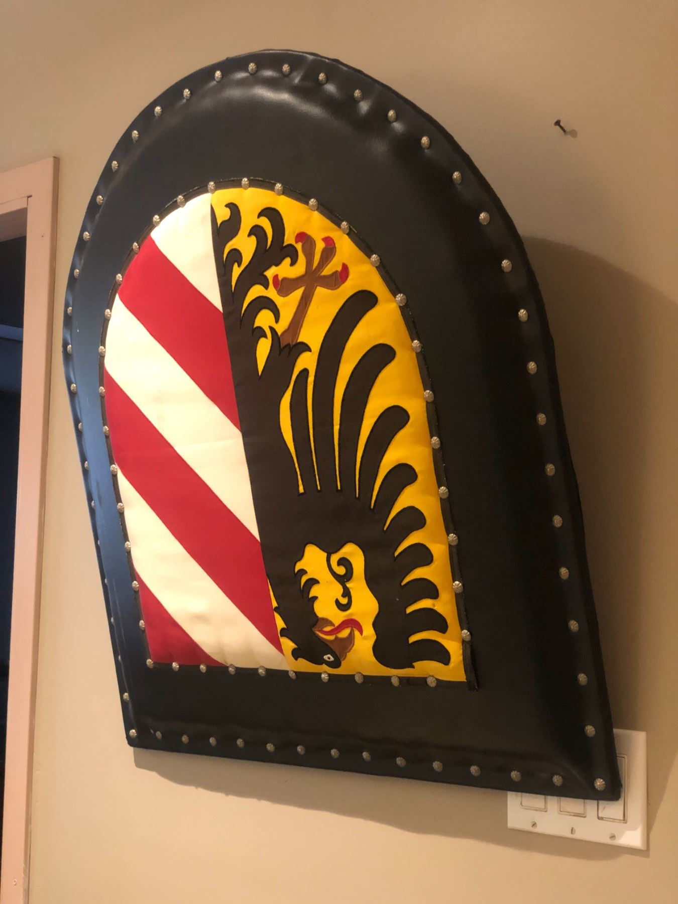"Motherland Fort Salem" - Watches flag shield on wood and leather plaque (approx 29 1/2" x 32")