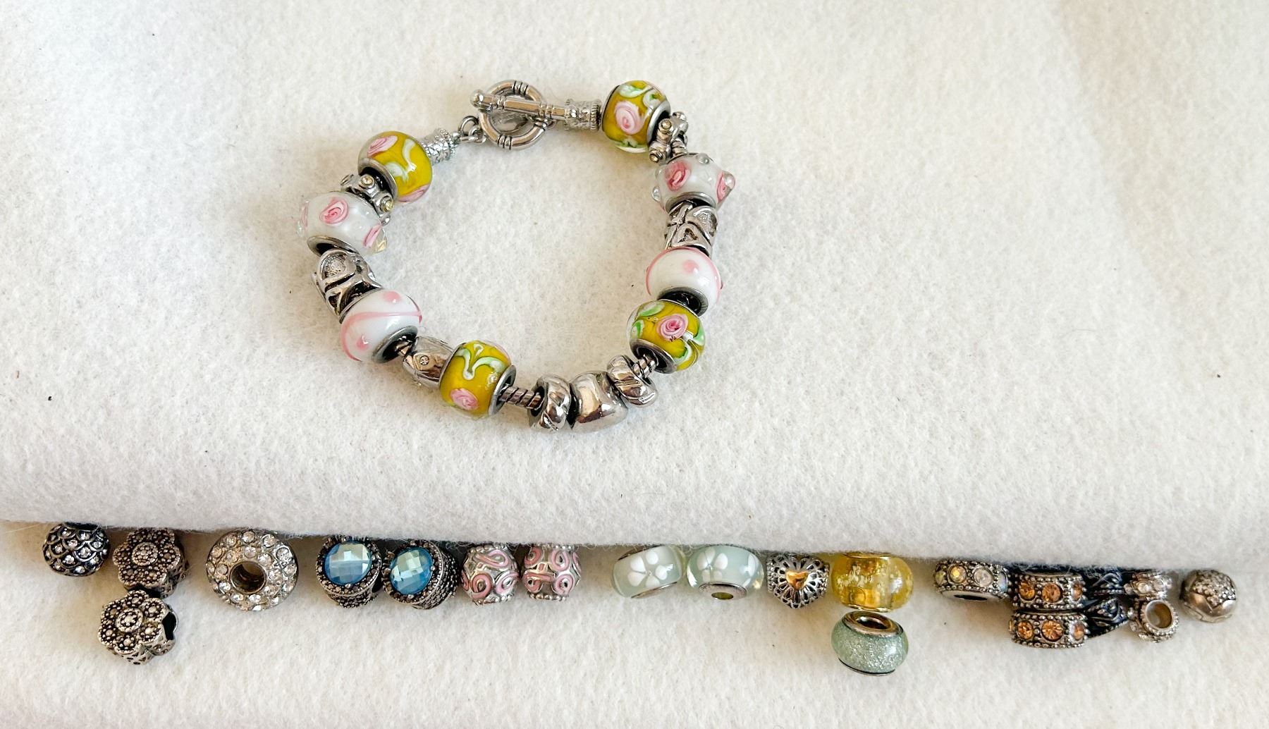 Lovely charm bracelet featuring a mix of Murano-style glass beads and silver-tone accents, including floral, crystal, and heart motifs. Additional loose beads included for customizing.