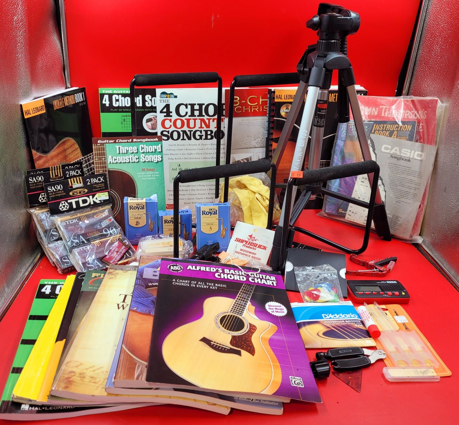 Music Lot w/ Tripod, Music Books, Cassette Tapes, Korg Metronome, & More