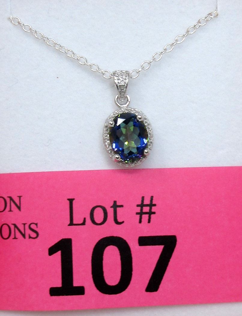Lively blue purple 7 x 9 mm mystic topaz. 2.5 CT. Halo setting. Includes chain & $250 certificate.