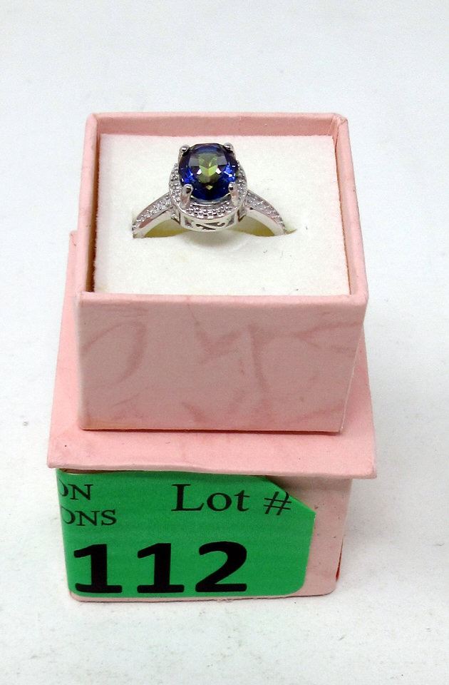 Oval cut, deep blue mystic topaz with 2 shoulder diamonds. Retail value $240.