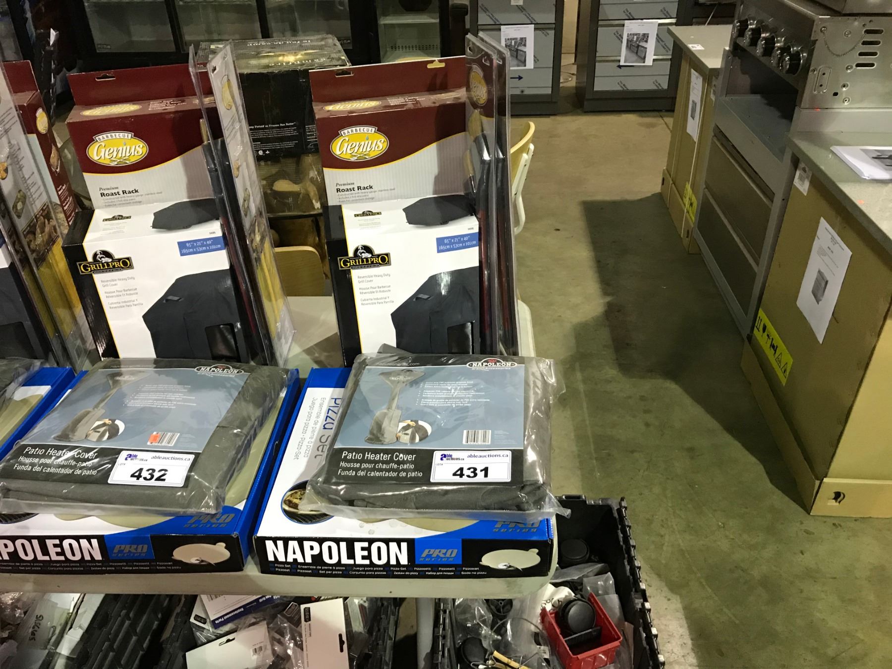 NAPOLEON PRO PIZZA STONE, NAPOLEON PATIO HEATER COVER, GRILLPRO 65" X 21" X 40" HEAVY DUTY GRILL COVER, BARBEQUE GENIUS ROAST RACK & 2 BASTING BRUSHES