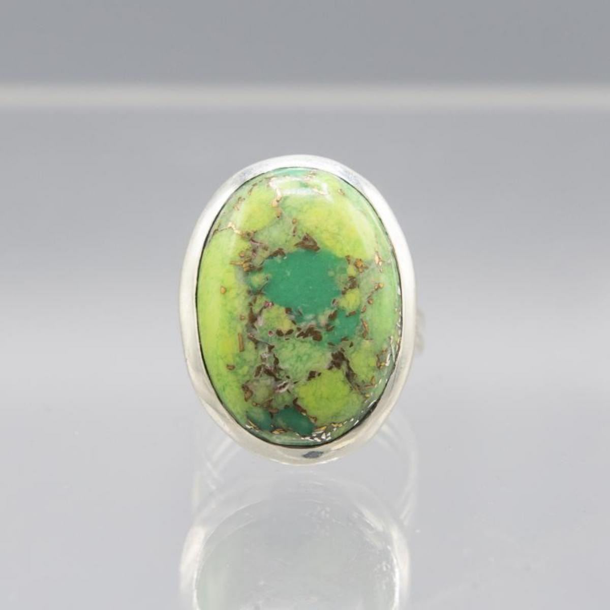 BEAUTIFUL RARE NATURAL 14.5 CT GREEN TURQUOISE RING WITH COPPER HIGHLIGHTS. MOUNTED IN SOLID .925 STERLING SILVER. SIZE 7 TO 12 ADJUSTABLE. TOTAL GRAM WT. IS APPROX 8.7 TOTAL GRAMS.