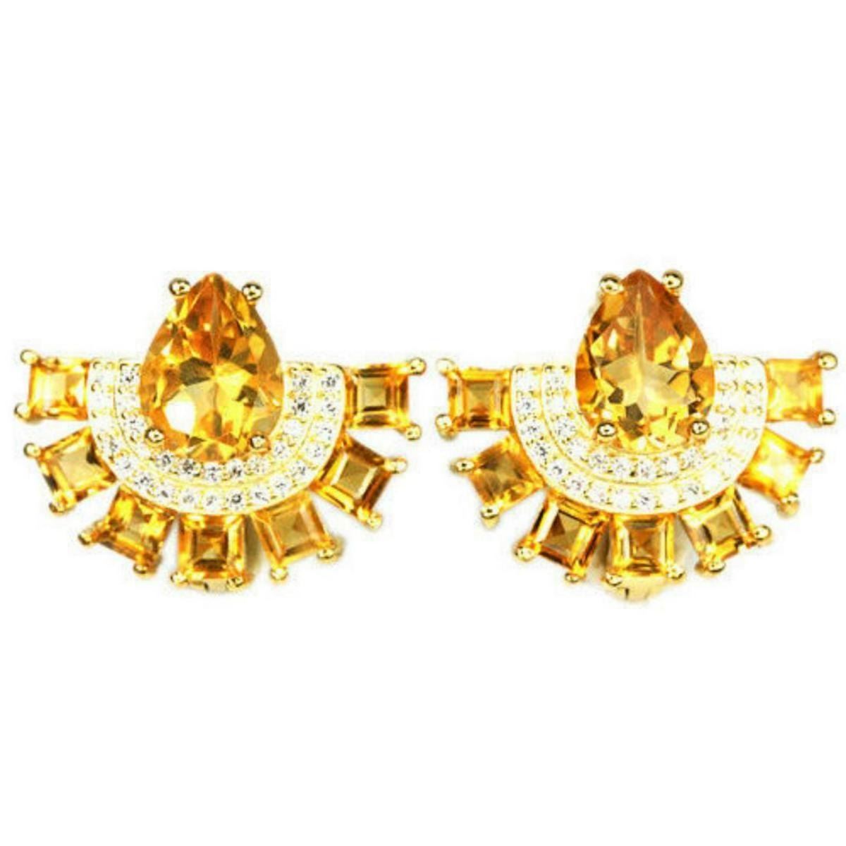 NATURAL ORANGISH YELLOW CITRINE & CZ 925 SILVER EARRING 14K YELLOW GOLD COAITNG; STONE SHAPEPEAR PORTUGUESE CUT & SQUARTZ FACET CUTSTONE DIMENSION9 X 7 MM. & 3 X 3 MM.ITEM WEIGHT6.3 GRAMCOLORAAA ORANGISH YELLOWCLARITYIF - VVSLUSTERDAZZLINGTREATMENTUNHEATEDORIGIN OF STONEBRAZILHARDNESS7.0OTHERFACE OF EARRING 20 X 16 MM. WHITE CUBIC ZIRCONIA 1 MM.