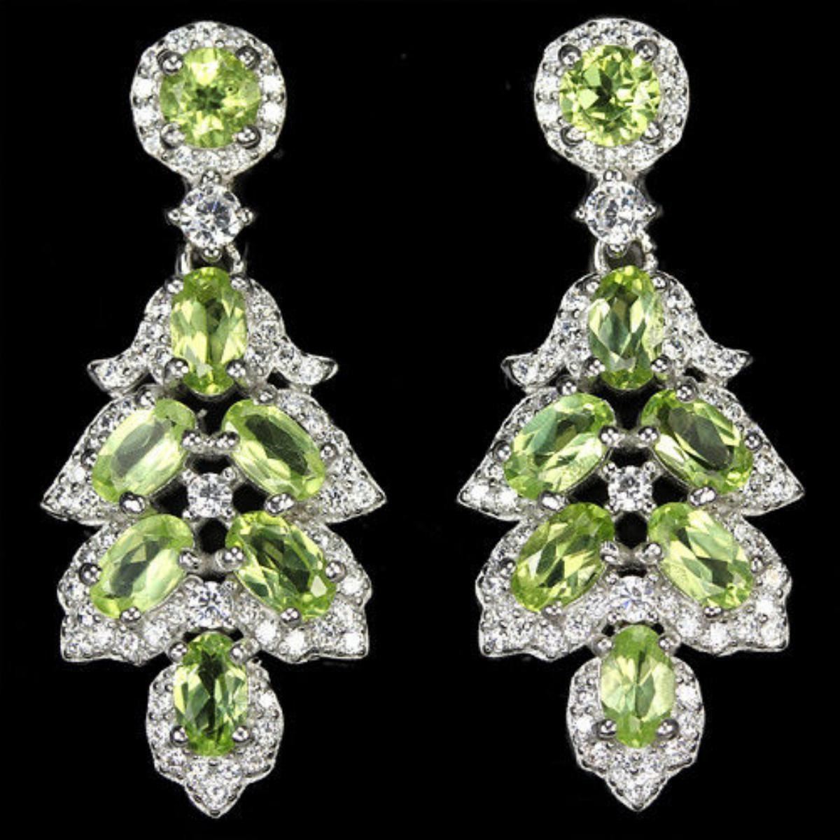 NATURAL GREEN PERIDOT OVAL & WHITE CZ 925 SILVER EARRING 14K WHITE GOLD COATING;STONE SHAPEOVAL PORTUGUESE CUTSTONE DIMENSION5 X 3 MM.ITEM WEIGHT6.7 GRAMCOLORGREENCLARITYVVS - VSLUSTERDAZZLINGTREATMENTUNHEATEDORIGIN OF STONEASIAHARDNESS6.5;FACE OF EARRING 32 X 12 MM. WHITE CUBIC ZIRCONIA 1 MM. & 1.7 MM.