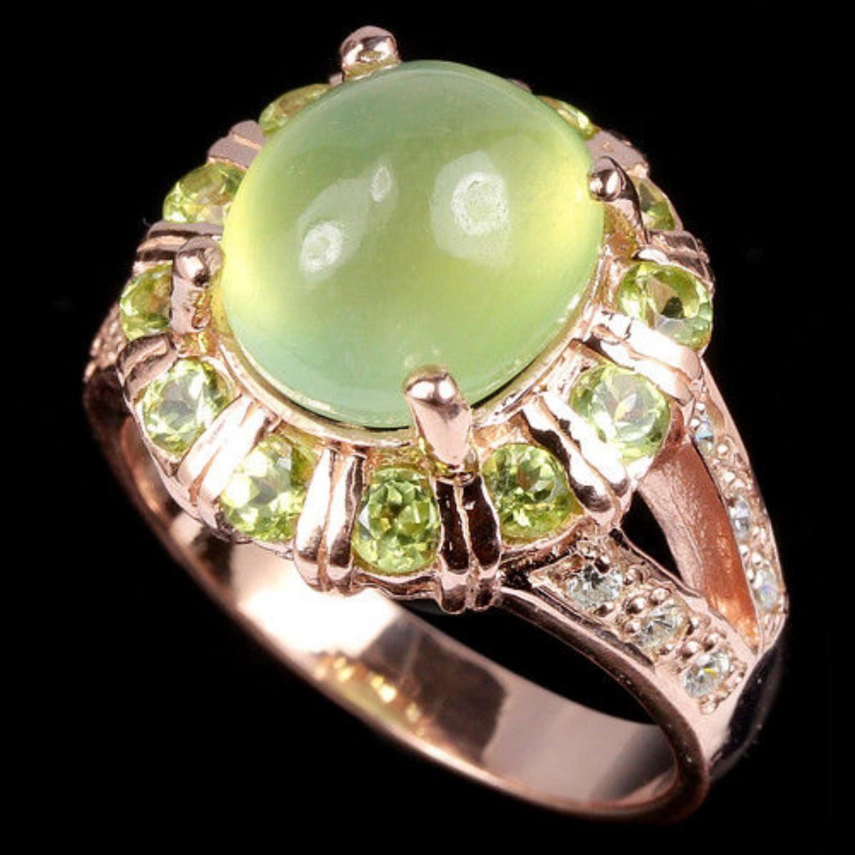 NATURAL AAA GREEN PREHNITE PERIDOT & CZ 925 SILVER RING 14K PINK GOLD COATING;RING SIZE 6.50 ( can be resized )ITEM QUANTITY1STONE SHAPEOVAL CABOCHON CUTSTONE DIMENSION10.2 X 9 X 6.4 MM.ITEM WEIGHT5.9 GRAMCOLORGREENCLARITYTRANSLUCENTLUSTERALLURINGTREATMENTUNHEATED;ORIGIN OF STONEAUSTRALIA;HARDNESS6.0 - 6.5OTHERFACE OF RING 20 X 15 MM. PERIDOT 2.5 MM. WHITE CUBIC ZIRCONIA 1.5 MM.