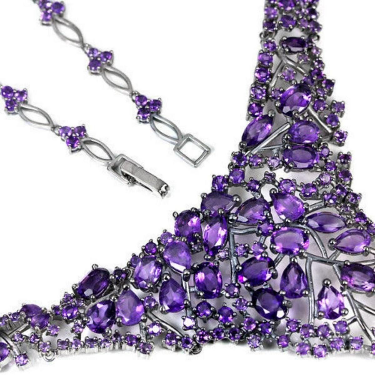 Natural PURPLE AMETHYST ROUND 925 SILVER FLOWER NECKLACE 14K BLACK GOLD COATING; LENGTH OF ITEM (Inch.)19.00;ITEM QUANTITY1STONE SHAPEMIXED SHAPESTONE DIMENSION8 X 4 MM. , 7 X 5 MM. , 5 X 3 MM. , 4 X 3 MM. , 2.7 MM. , 2.2 MM. & 1.7 MM.ITEM WEIGHT39.6 GRAMCOLORPURPLECLARITYIF - VVSLUSTERGRACEFULTREATMENTUNHEATEDORIGIN OF STONEBRAZILHARDNESS7.0