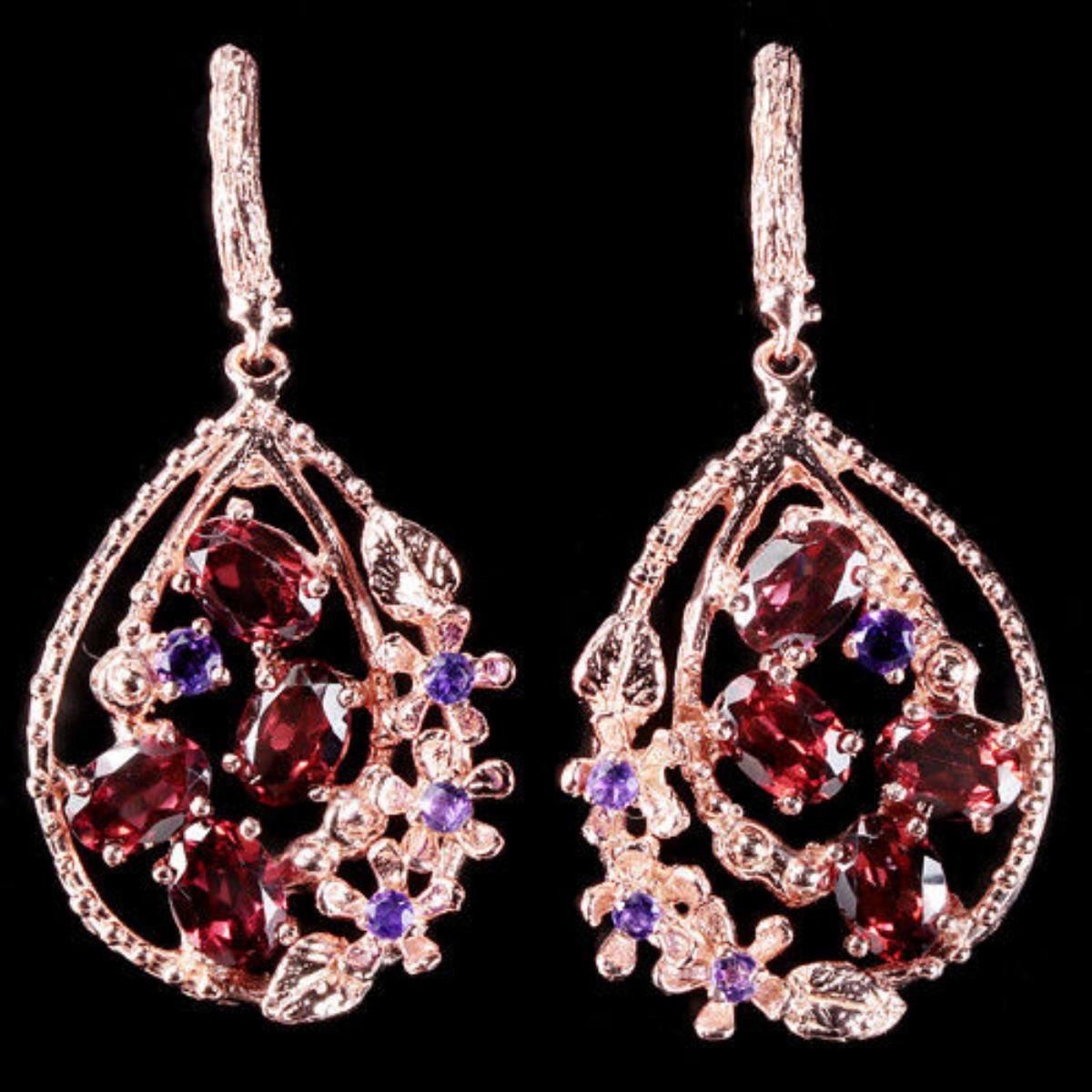 NATURAL AAA RHODOLITE GARNET & AMETHYST 925 SILVER EARRING 14K PINK GOLD COATING;STONE SHAPEOVAL & ROUND PORTUSGUESE CUTSTONE DIMENSION7 X 5 MM. & 2.2 MM.ITEM WEIGHT12.2 GRAMCOLORPINK RASPBERRY & PURPLECLARITYIF - VVSLUSTERGORGEOUSTREATMENTUNHEATEDORIGIN OF STONEAFRICA & BRAZILHARDNESS7.0 - 7.5;FACE OF EARRING 47 X 22 MM.