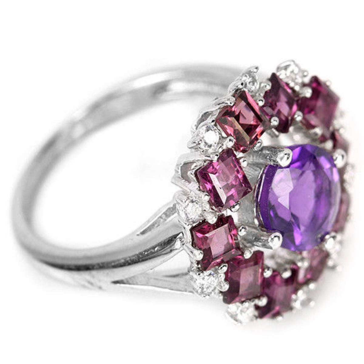 PURPLE AMETHYST, RHODOLITE GARNET CZ 925 SILVER RING 14K WHITE GOLD COATING; RING SIZE 6.50 ( can be resized ) ITEM QUANTITY 1 STONE SHAPE ROUND PORTUGUESE CUT SQUARE FACET CUT STONE DIMENSION 7 MM. , 3 X 3 MM. ITEM WEIGHT 3.95 GRAM COLOR PURPLE PURPLE PINK CLARITY IF TO VVS LUSTER ENCHANTING TREATMENT NATURAL UNHEATED ORIGIN OF STONE BRAZIL AFRICA HARDNESS 7 - 7.5 OTHER FACE OF RING 17 X 17 MM. WHITE CUBIC ZIRCONIA 1.2 MM.