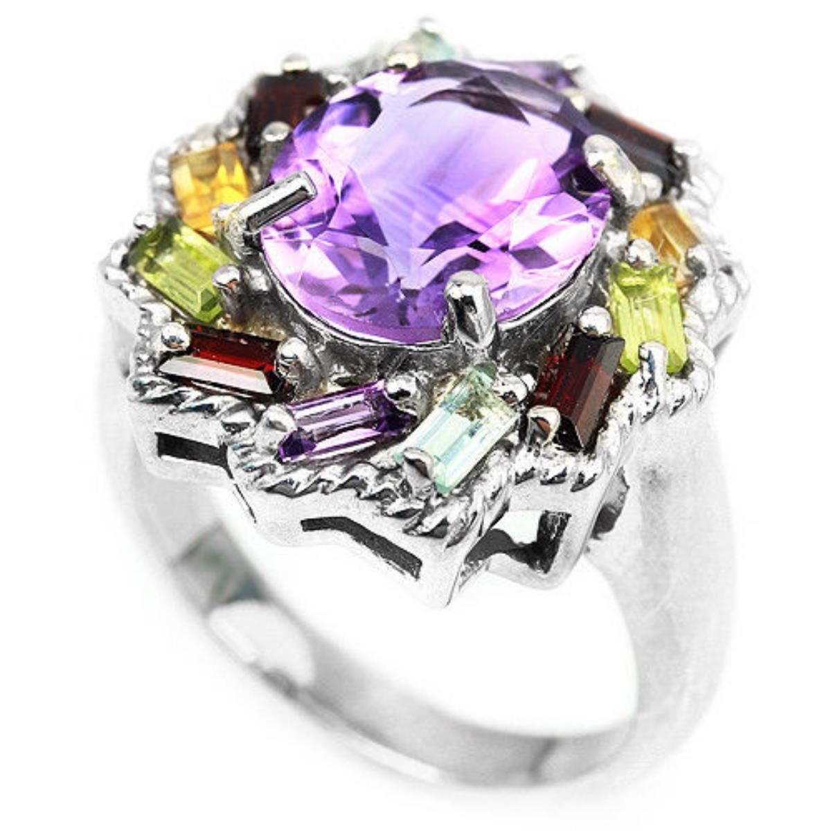 REAL AMETHYST TOPAZ CITRINE PERIDOT GARNET 925SILVER RING 14K WHITE GOLD COATING; RING SIZE8.00 ( resizable )ITEM QUANTITY1STONE SHAPEBAGUETTE & OVALSTONE DIMENSION12 X 10 MM. & 5 X 2 MM.ITEM WEIGHT8.4 GRAMCOLORMULTI COLORCLARITYIF, VVS - VSLUSTERALLURING;TREATMENTNATURAL UNHEATED & IRRADIATION;ORIGIN OF STONEAFRICA, ASIA, BRAZIL & CAMBODIA;HARDNESS6.5 - 8.0;FACE OF RING 20 X 19 MM.
