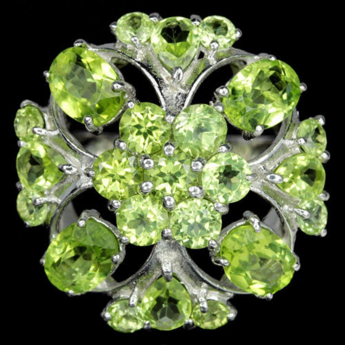 NATURAL APPLE GREEN PERIDOT 925 SILVER FLOWER RING 14K WHITE GOLD COATING; RING SIZE6.75 ( can be resized )ITEM QUANTITY1STONE SHAPEMIXED SHAPESTONE DIMENSION7 X 5 MM. , 5 X 4 MM. , 4 MM. & 3 MM.ITEM WEIGHT6.3 GRAMCOLORAPPLE GREENCLARITYIF - VVSLUSTERDAZZLINGTREATMENTUNHEATEDORIGIN OF STONEASIAHARDNESS6.5;FACE OF RING 25 X 25 MM.