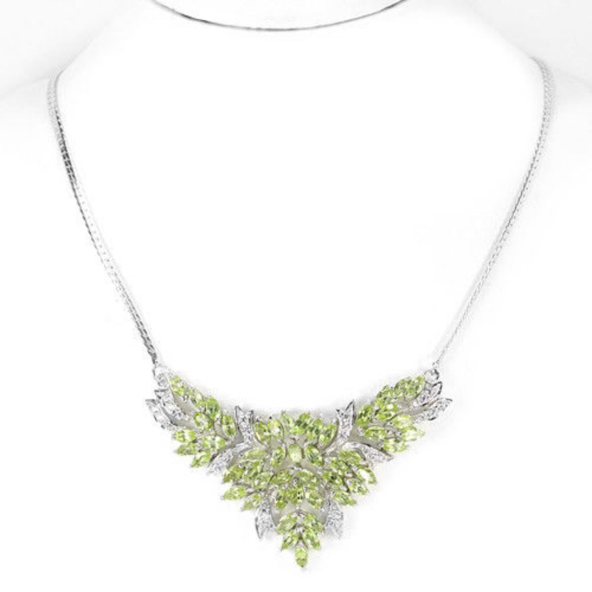 NATURAL APPLE GREEN PERIDOT & WHITE CZ 925SILVER NECKLACE 14K WHITE GOLD COATING; LENGTH OF ITEM (Inch.)17.50 ;ITEM QUANTITY1STONE SHAPEMARQUISESTONE DIMENSION5 X 2.5 MM.ITEM WEIGHT16.9 GRAMCOLORAPPLE GREENCLARITYIF - VVSLUSTERDAZZLINGTREATMENTUNHEATEDORIGIN OF STONEASIAHARDNESS6.5WHITE CUBIC ZIRCONIA 1.5 MM.