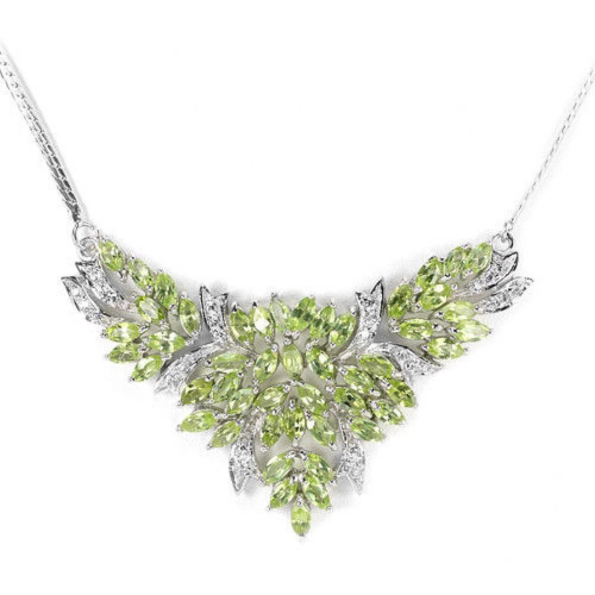 NATURAL APPLE GREEN PERIDOT & WHITE CZ 925SILVER NECKLACE 14K WHITE GOLD COATING; LENGTH OF ITEM (Inch.)17.50 ;ITEM QUANTITY1STONE SHAPEMARQUISESTONE DIMENSION5 X 2.5 MM.ITEM WEIGHT16.9 GRAMCOLORAPPLE GREENCLARITYIF - VVSLUSTERDAZZLINGTREATMENTUNHEATEDORIGIN OF STONEASIAHARDNESS6.5WHITE CUBIC ZIRCONIA 1.5 MM.