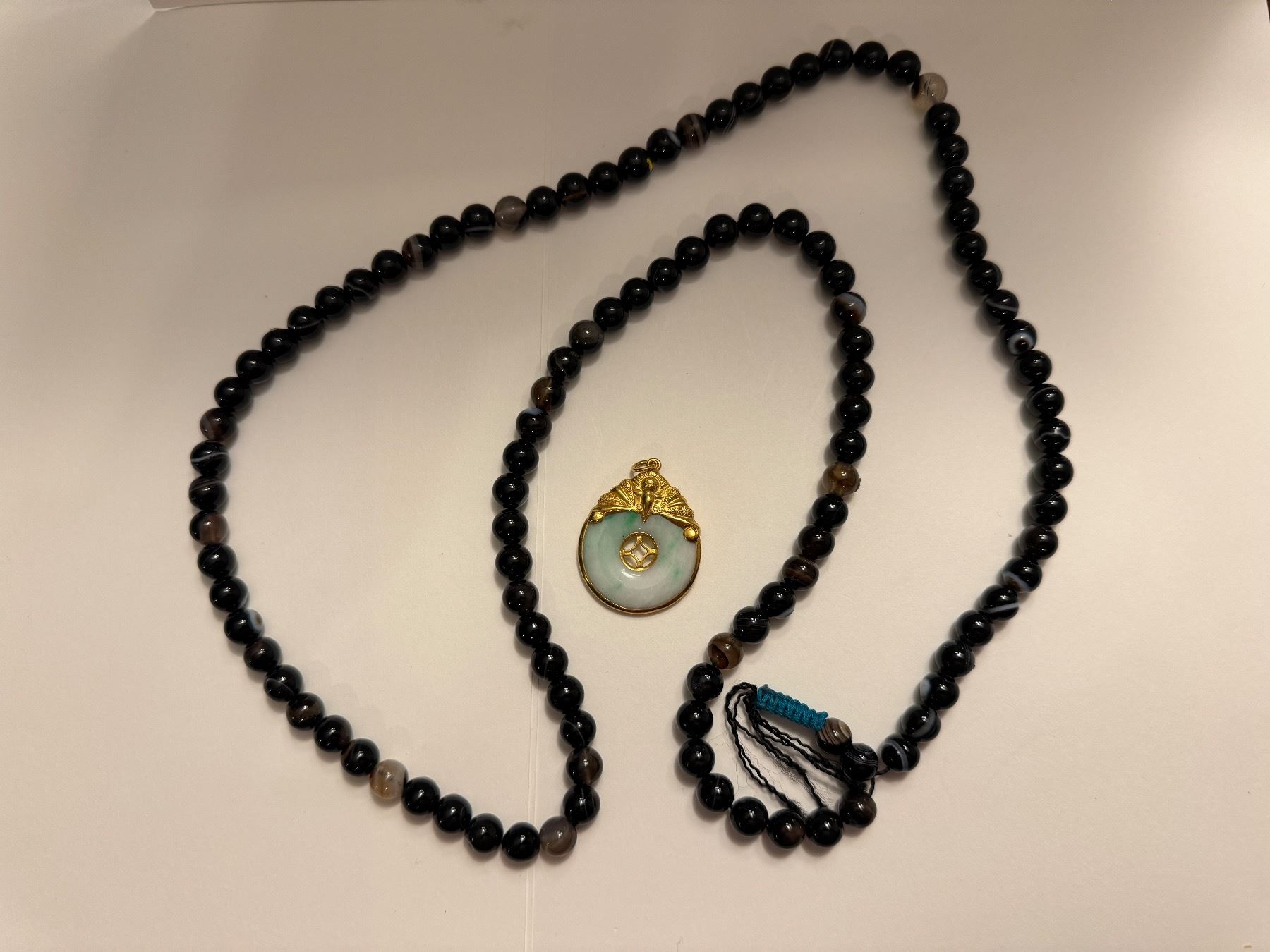 NATURAL BURMESE JADEITE AND 22KT YELLOW GOLD PENDANT ONE LONG STRAND OF BLACK, BROWN AGATE BEADS, 85CM LONG TOTAL REPLACEMENT $1,800.00 APPRAISAL INCLUDED