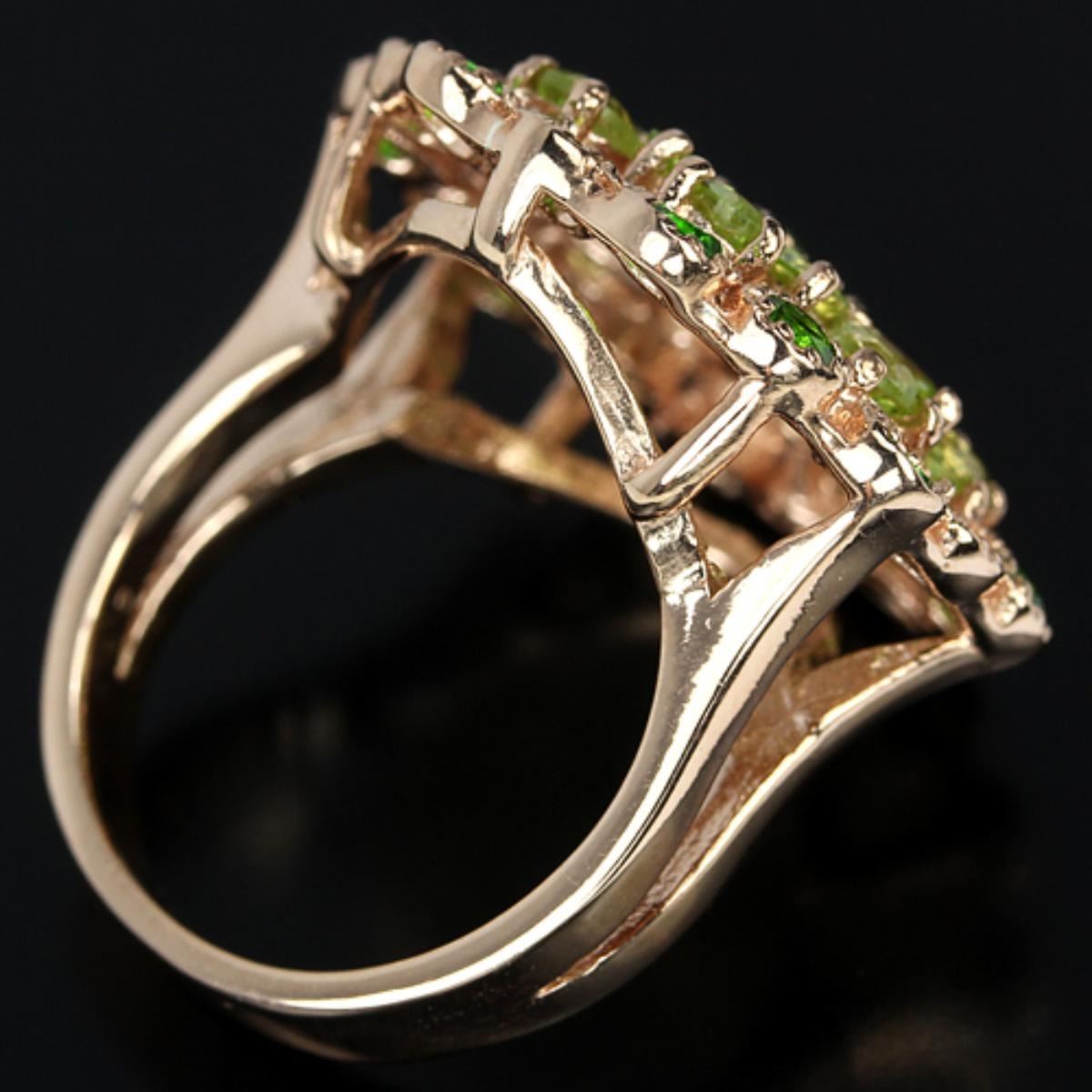 NATURAL GREEN CHROME & APPLE GREEN PERIDOT 925 SILVER RING 14K PINK GOLD COATING;RING SIZE7.25 ( resizable )ITEM QUANTITY1STONE SHAPEMIXED SHAPESTONE DIMENSION5 X 3 MM. , 4 X 3 MM. & 2.7 MM.ITEM WEIGHT8.1 GRAMCOLORGREEN & APPLE GREENCLARITYIF - VSLUSTERDAZZLINGTREATMENTUNHEATEDORIGIN OF STONEAFRICA & ASIA;HARDNESS6.5 - 7.5;FACE OF RING 25 X 23 MM.;