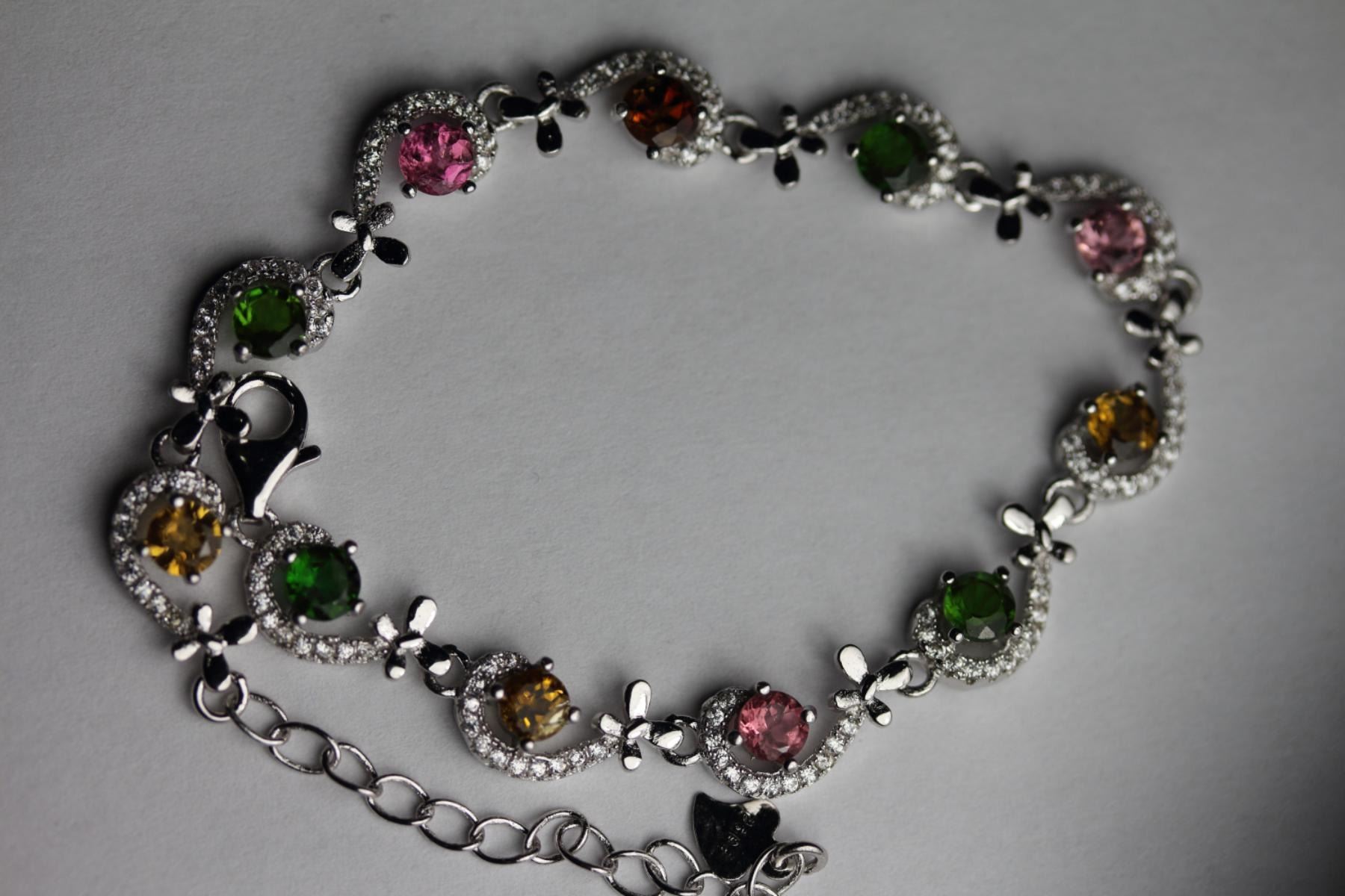NATURAL MULTI COLOR TOURMALINE Bracelet.............925 sterling silver with 14 k white gold plated....top luster fire...total weight 37.94 cts...Stone Origin Brazil....stone - 4.5 mm round shape'; adjustable length (6-8 inches)