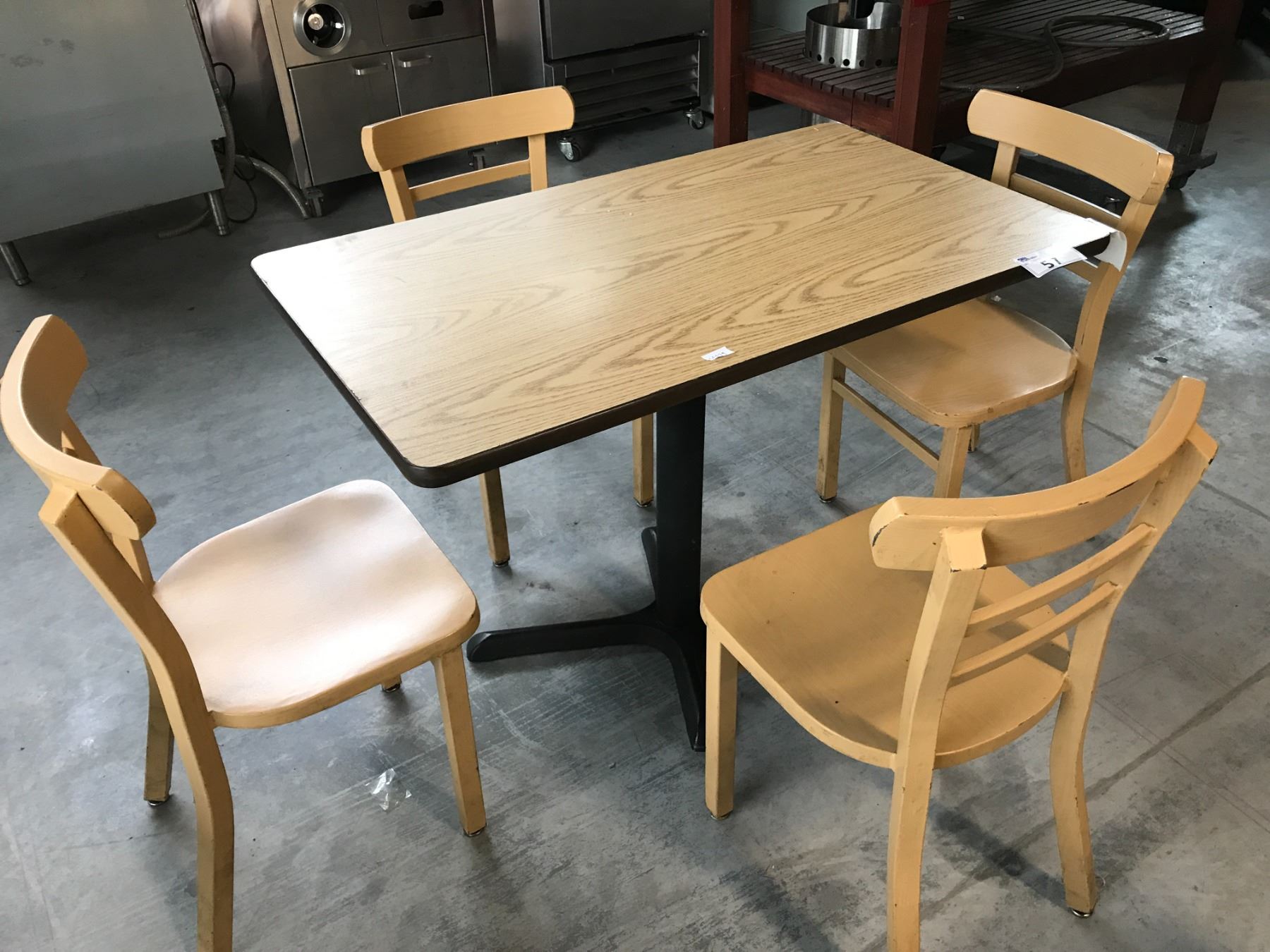 NATURAL OAK 3.5' X 2' BISTRO TABLE WITH 4 LIGHT WOOD GRAIN METAL BISTRO CHAIRS