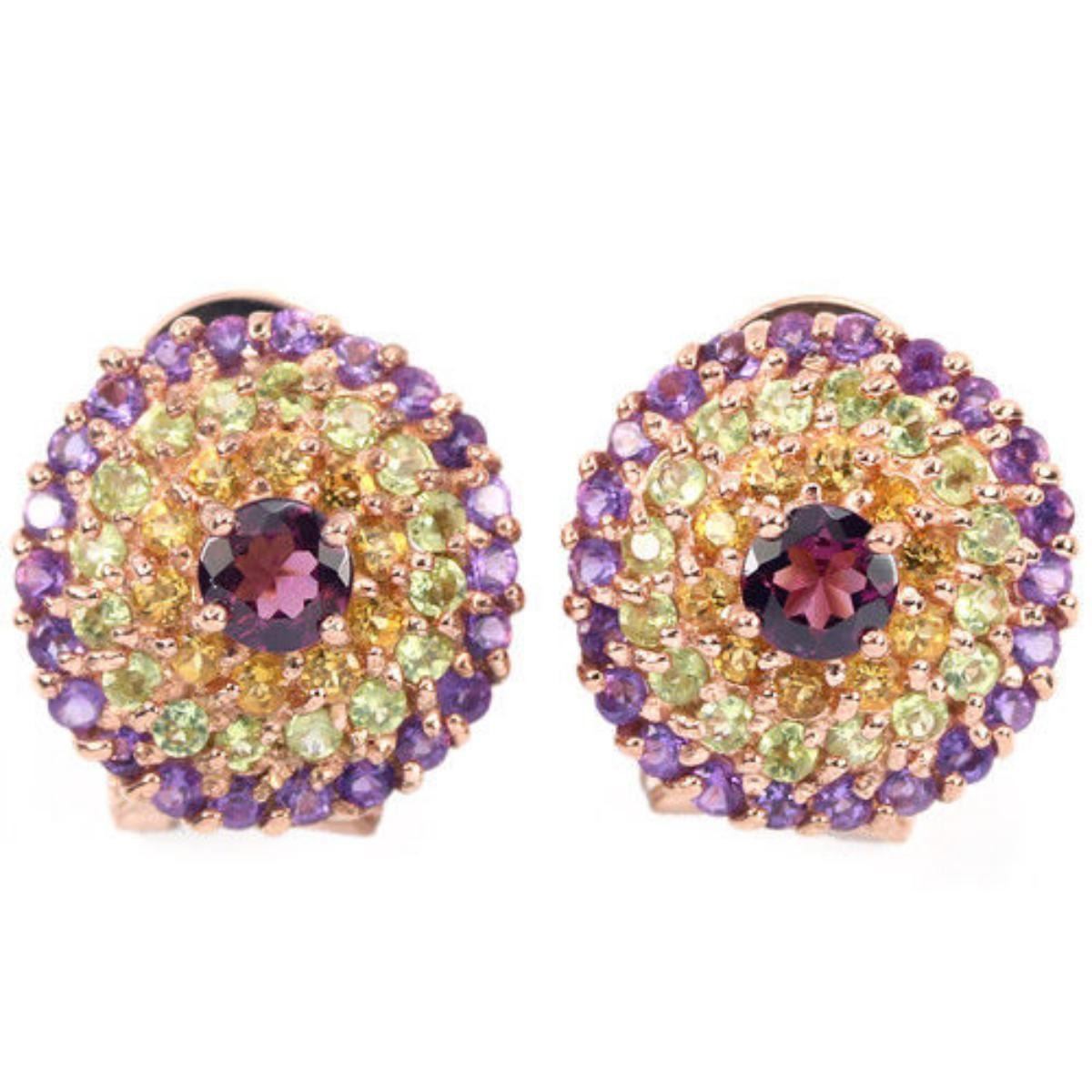 REAL RHODOLITE AMETHYST PERIDOT CITRINE 925 SILVER EARRING 14K PINK GOLD COATING;STONE SHAPE ROUND STONE DIMENSION 4.5 MM. , 2 MM. , 1.5 MM. ITEM WEIGHT 7.94 GRAM COLOR MULTI COLOR CLARITY VVS TO VS LUSTER ALLURING TREATMENT NATURAL UNHEATED ORIGIN OF STONE AFRICA, BRAZIL ASIA HARDNESS 6.5 - 7.5 ; FACE OF EARRING 15 X 15 MM.