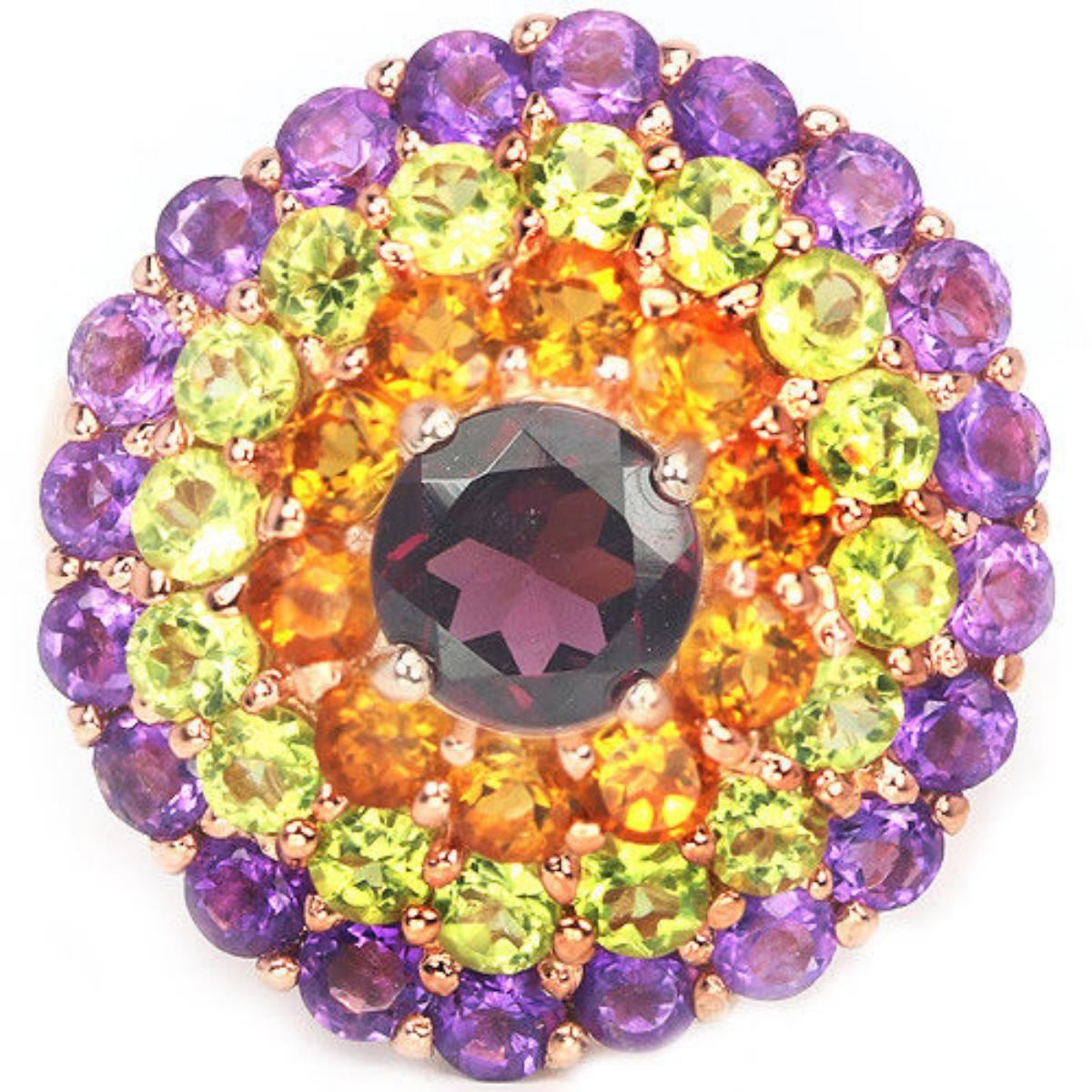 NATURAL RHODOLITE CITRINE PERIDOT AMETHYST 925 SILVER RING 14K PINK GOLD COATING;RING SIZE 8.00 ( resizeable )ITEM QUANTITY1STONE SHAPEROUNDSTONE DIMENSION6 MM. & 3 MM.ITEM WEIGHT7.57 GRAMCOLORMULTI COLORCLARITYIF - VVSLUSTERALLURINGTREATMENTNATURAL UNHEATEDORIGIN OF STONEBRAZIL, AFRICA & ASIAHARDNESS6.5 - 7.5OTHERFACE OF RING 20 X 20 MM.
