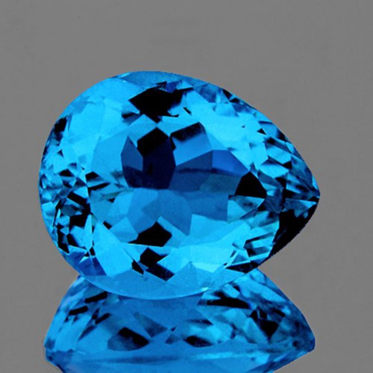 Natural Swiss Blue TopazSIZE ( L x W x D ) : 13.95 x 10.98 x 7.35 mmCOLOR : Swiss Blue Intense ColorSHAPE : PearQUANTITY : 1 pieceLUSTER : Excellent CLARITY : FLAWLESS-VVS (BEST QUALITY)HARDNESS : 8ORIGIN : Brazil TREATMENT : Standard