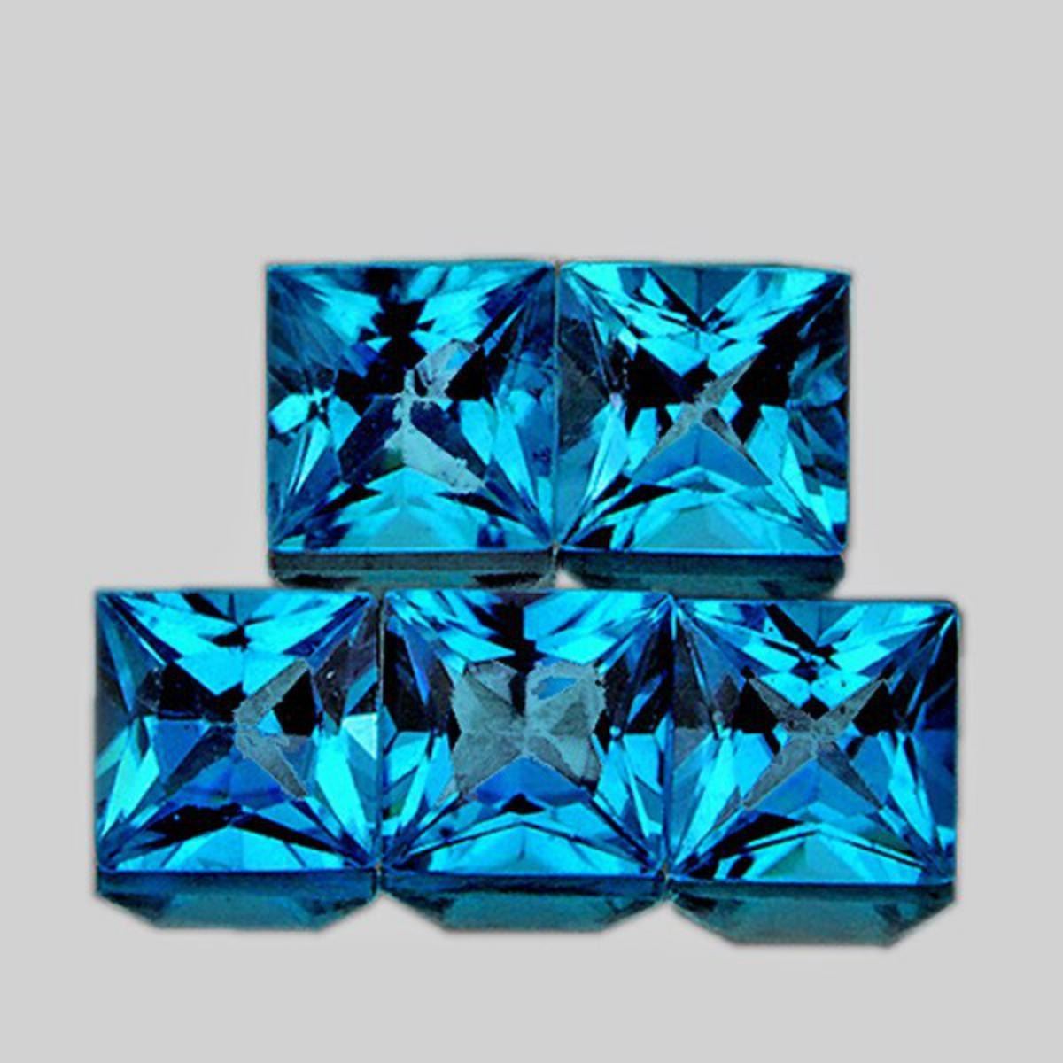 Natural Swiss Blue TopazSIZE ( L x W x D ) : 4.20 mmCOLOR : Swiss Blue Best Color SHAPE : Square Princess (Machine Cut)QUANTITY : 5 pieces LUSTER : Extreme Superb Brilliancy!CLARITY : FLAWLESS-VVS (BEST QUALITY)HARDNESS : 8ORIGIN : Brazil TREATMENT : Standard