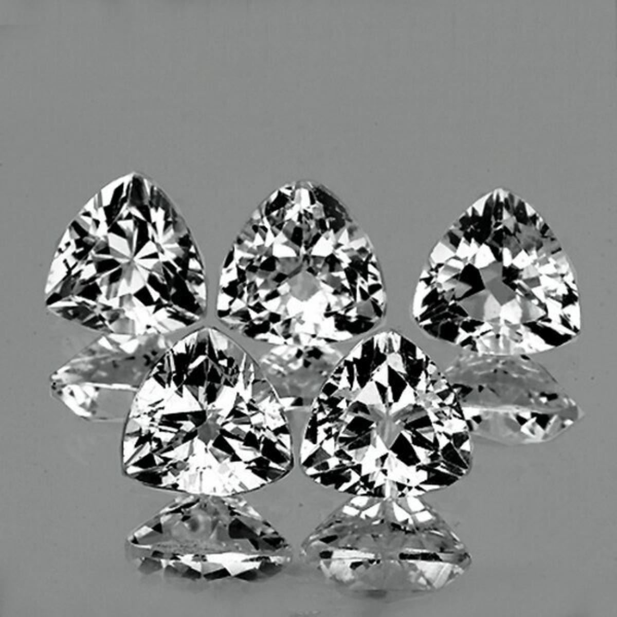 Natural White TopazSIZE ( L x W x D ) : 7.00 mm;COLOR : Top Diamond Colorless White;SHAPE : Trillion;QUANTITY ;: 5 pieces (Perfectly Matched Set);LUSTER : Excellent!CLARITY : FLAWLESS-VVS1 ; BEST QUALITYHARDNESS : 8;ORIGIN : Brazil; TREATMENT : None;