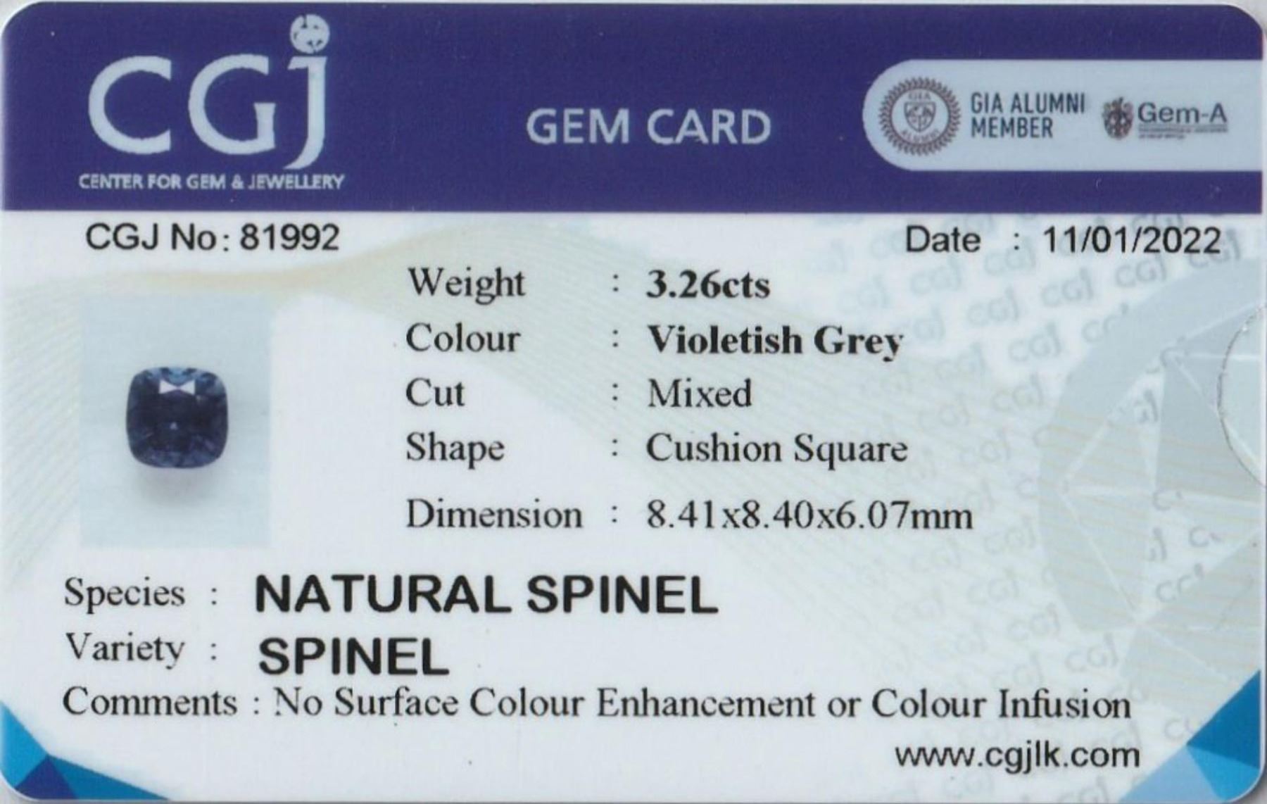 Natural Untreated Ceylon VIOLET Spinel 3.26 Cts - VVS/VS....cushion Cut ...size 8.41 X 8.40 X 6.07 MM...Origin - Ceylon....