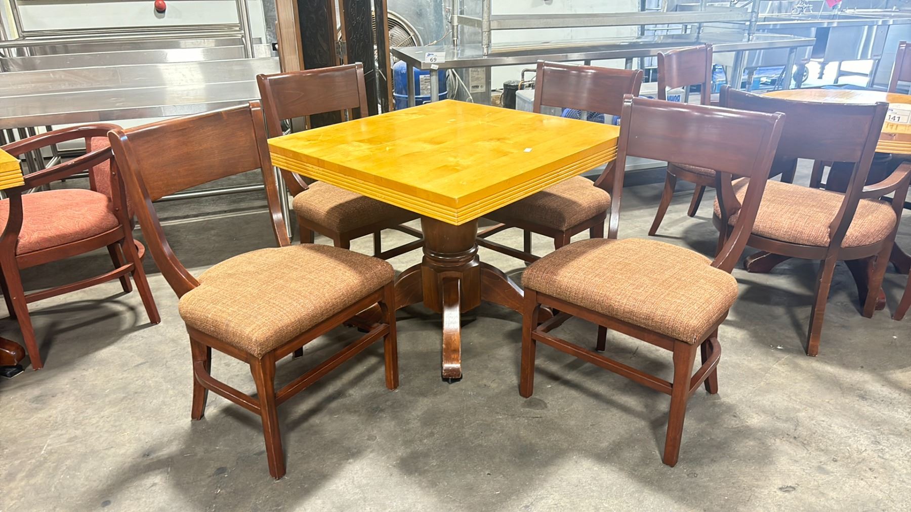 NATURAL WOOD TOP 36" SQUARE DARK WOOD SINGLE PEDESTAL COMMERCIAL CAFE TABLE WITH 4 DARK WOOD PADDED CAFE SIDE CHAIRS